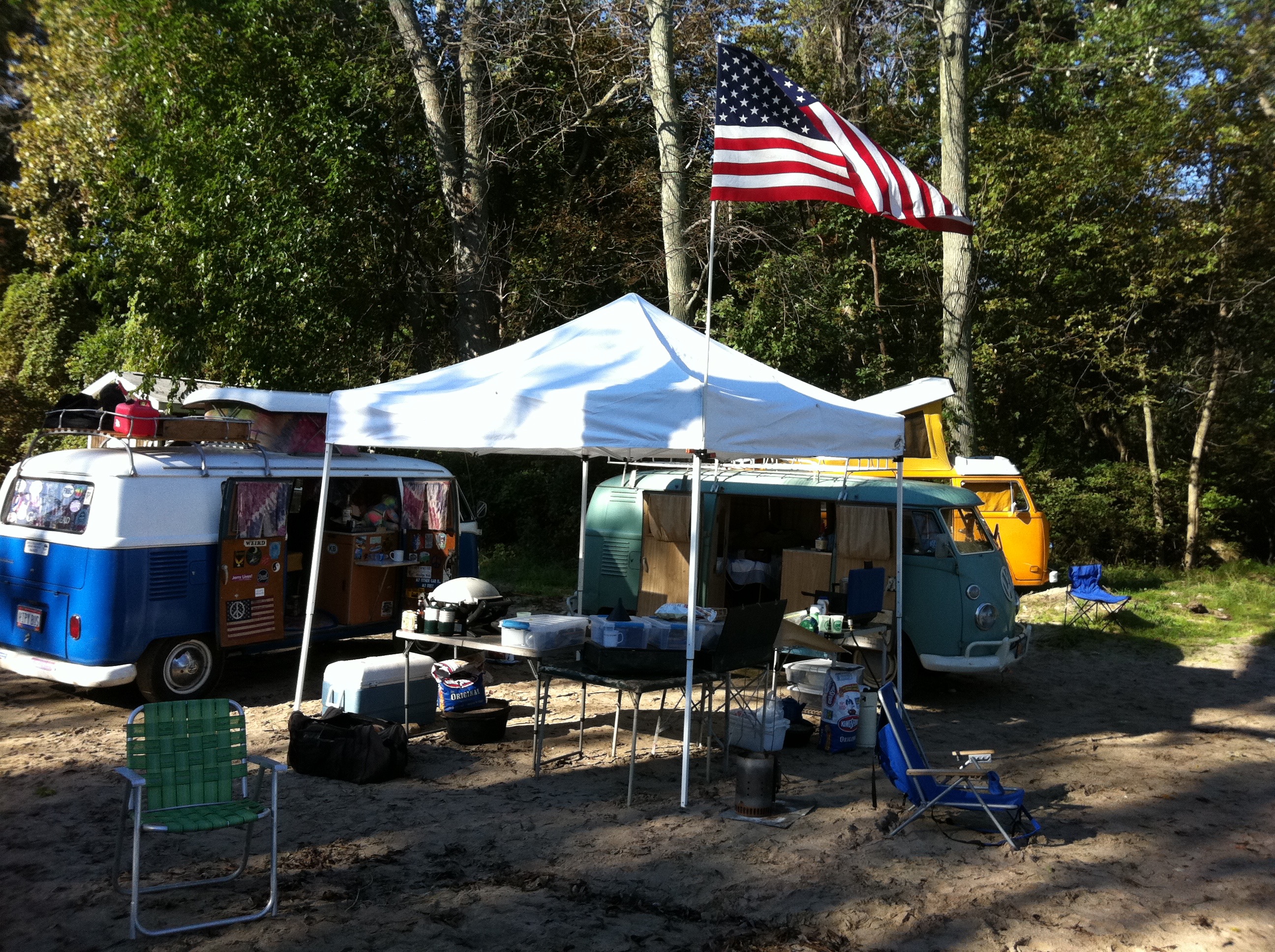 When you see this sign, you know the fun is about to begin... I think it was a "panel" theme this year... Carlos from Lorain brought Ken's '64 "Vegas" bus, (a former panel modified by Bowman and Son's into a camper) to the island. The paint and bodywork on this bus was nothing short of spectacular. Randy and Frank had a beachfront compound. Frank brought the OVT colors. It doesn't get better than this. This year, there was even some boating going on, LEAKOIL style. Hank and Sue made it up. Camp Cunningham. Gregg and I scored some primo parking, but no one made an offer on my bus.
