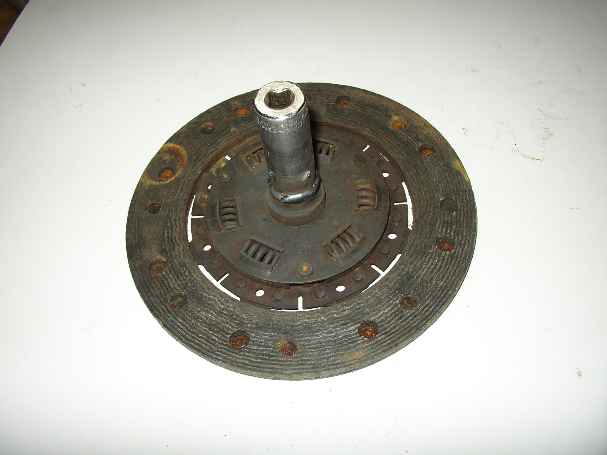 I wanted to "test" my tranny somehow before pulling the shift linkage, so Aaron donated a junk clutch disc so I could weld a fitting to it.