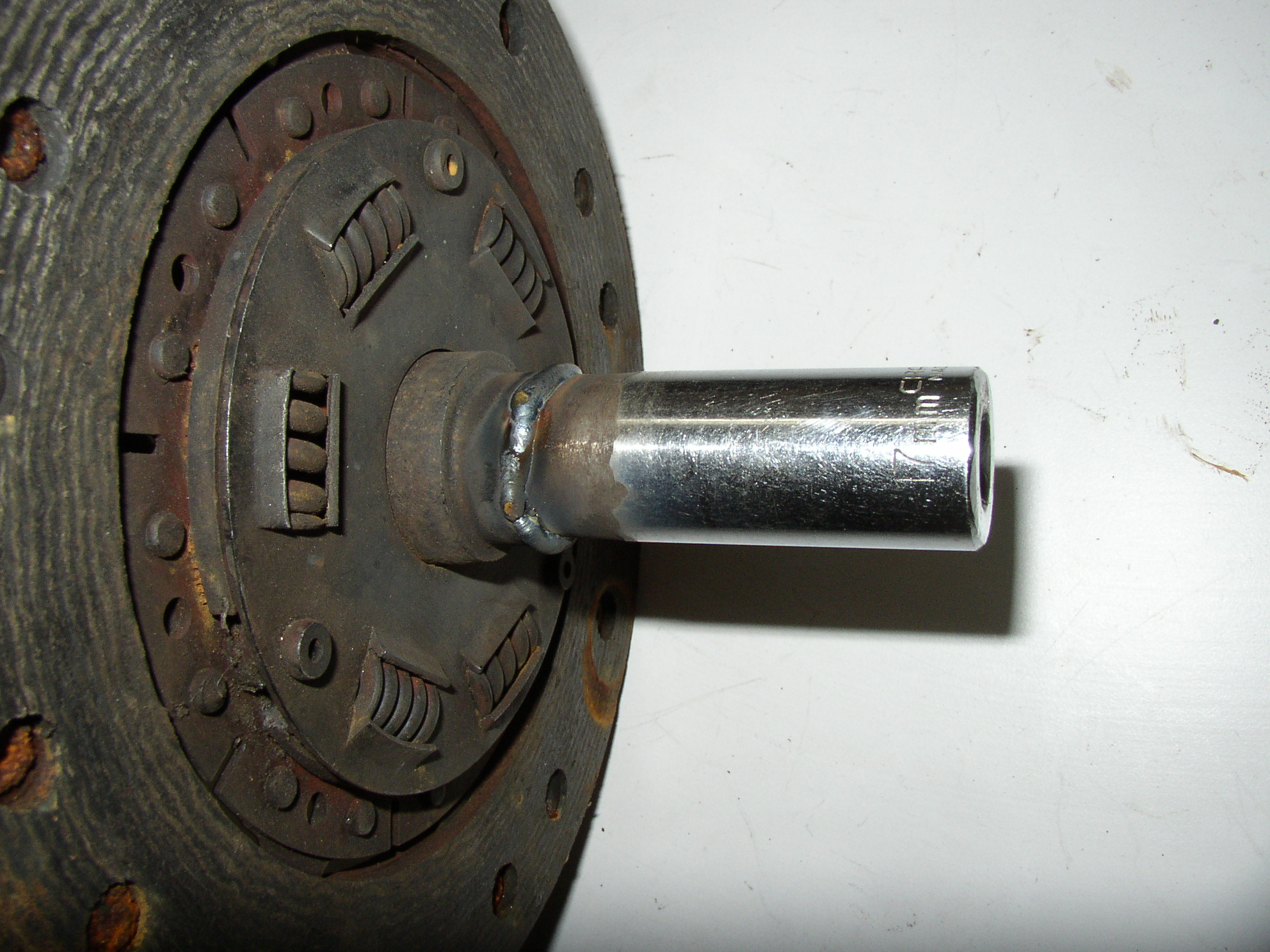 I wanted to "test" my tranny somehow before pulling the shift linkage, so Aaron donated a junk clutch disc so I could weld a fitting to it.