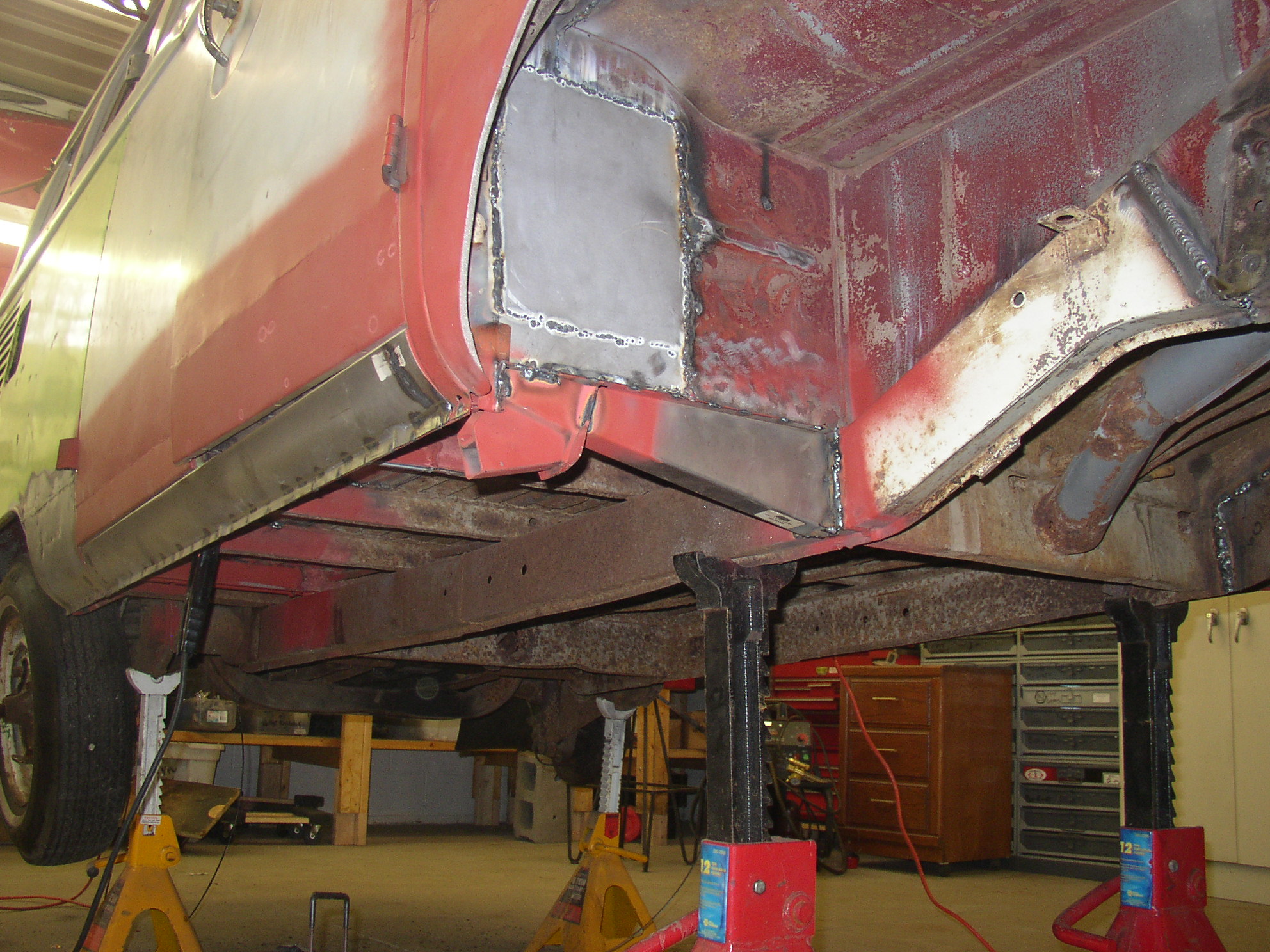 The concrete block under the nose has an adjustable jackstand on it (house style) and is only holding maybe 50-100lbs so when I cut the frame out nothing sags. The nose of that bus is so light gutted it's not even funny. I'm sure I could grunt it up in the air from below if needed. It wiggles dangerously on the stands, so much I have a safety chain going through the windows to the beam overhead just "in case".