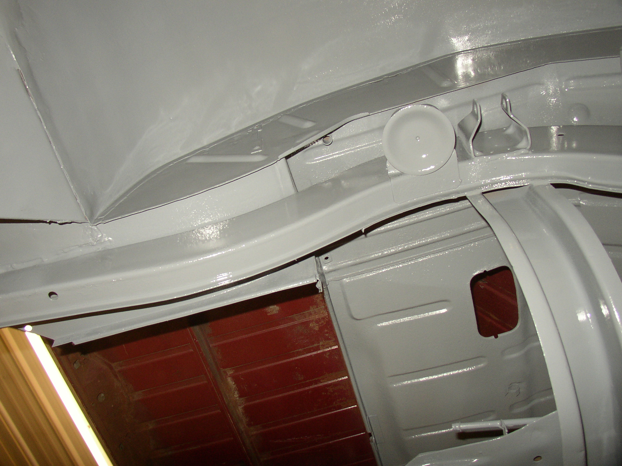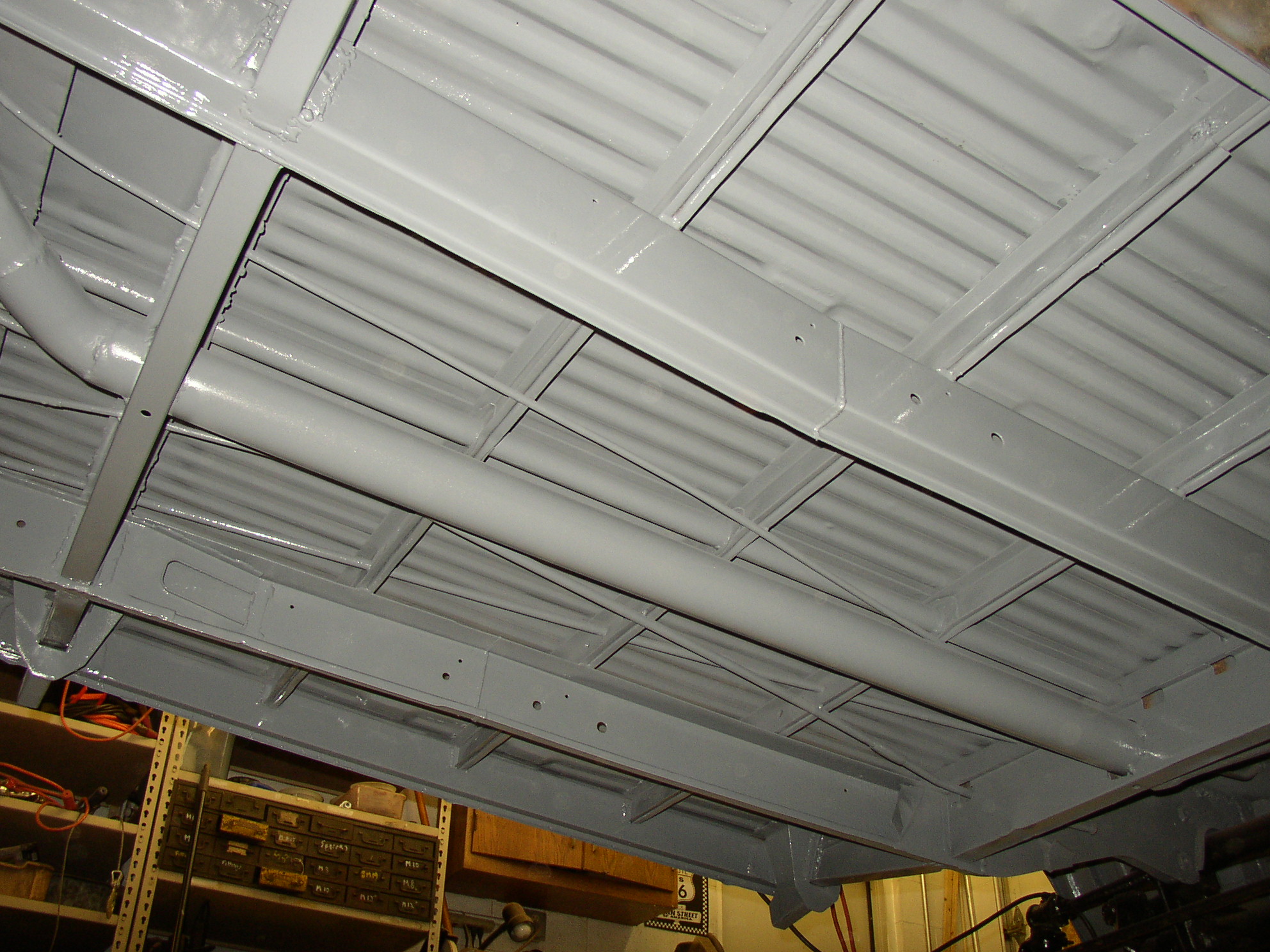 I finished fiberglassing the bottom of the floorpan seams, cleaning, grinding and blasting the center section and shot it. (I had already done the front third, now this is the center third) What a f'ing PITA that is to shoot paint upside down! I had to use my crappiest HF gun with a bottom siphon cup. All of my better guns are top feed which you can't use painting the bottom of a vehicle because the cup is in the way.