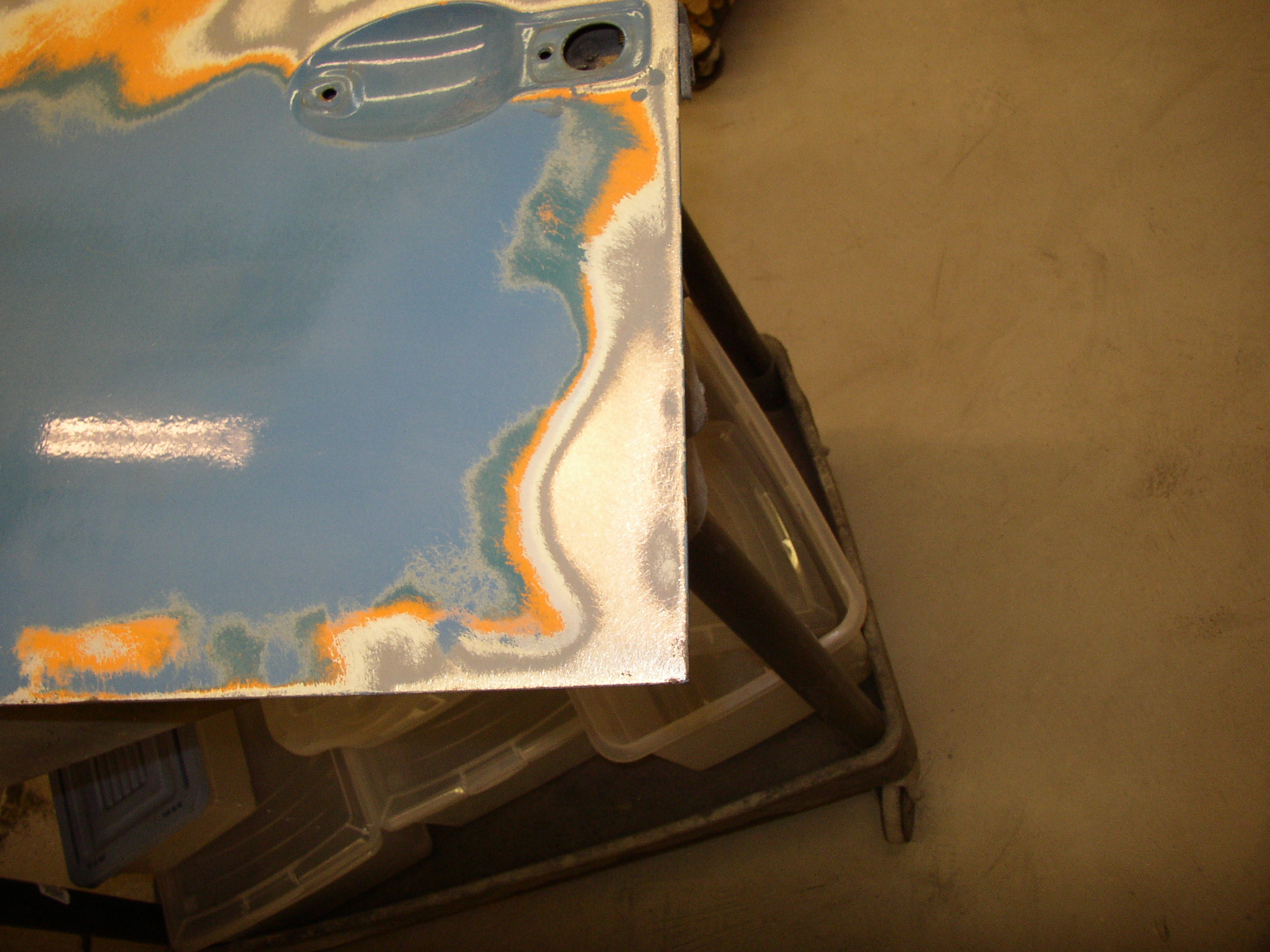 I removed the Bondo from the dent in the middle and worked it out from the inside, it came out quite well and will only need a skim coat instead of the 3/4" it had. I stripped the paint to find many coats, this was a '67 Deluxe door- it looks like the original bus was yellow bottom, white top, and repainted blue, but there's no factory yellow color in splitties, so I guess it changed color at least twice in its life. There might be 7 layers if you count primer- 2 blues, yellow, and white. :roll: