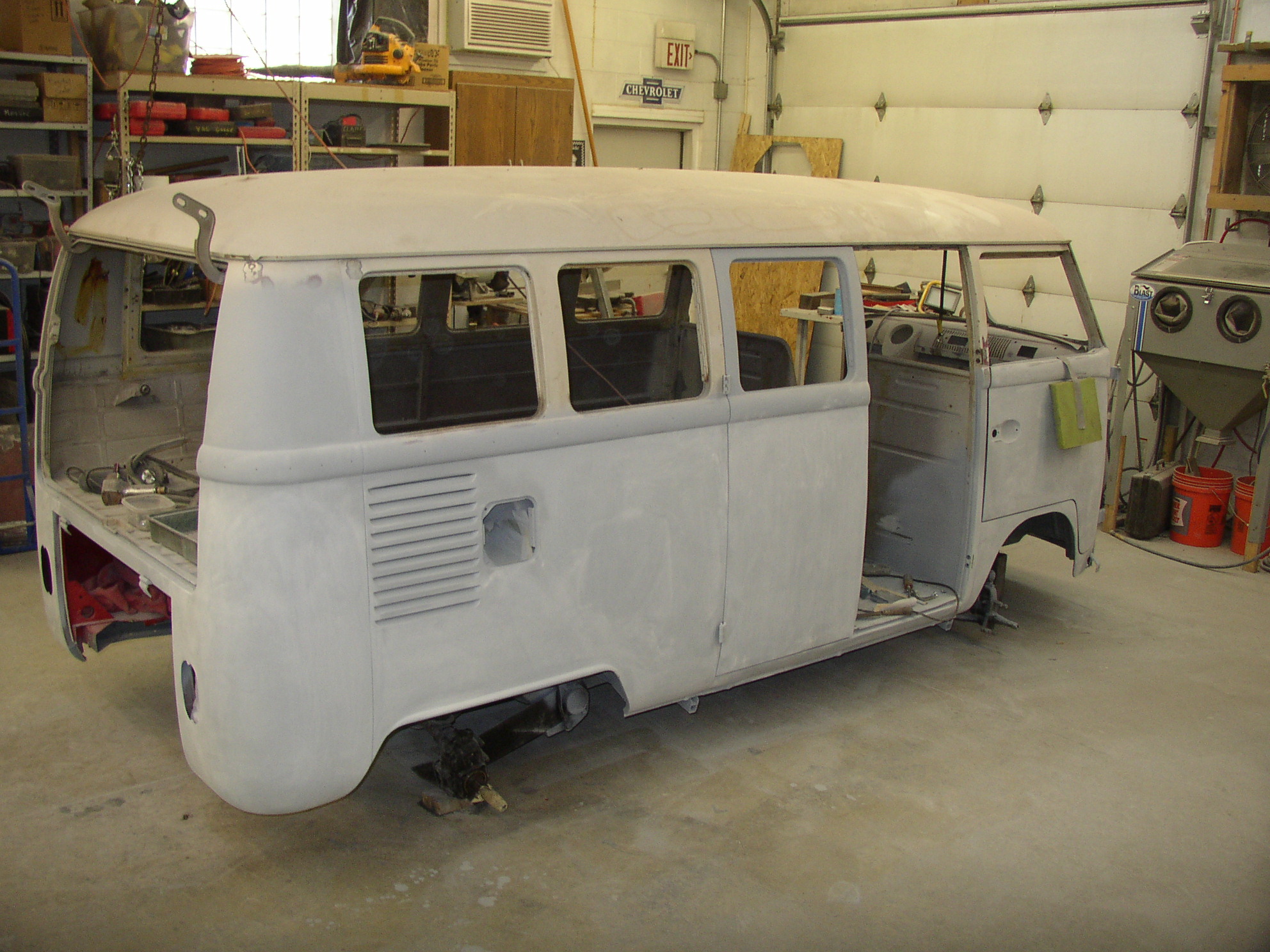 Worked a long day today and got a shitload done- dropped it down and started on the roof- DA'd the whole roof, wire wheeled the rain gutters, unwrinkled some wrinkles in the roof, and a few skim coats of mud. Also wirewheeled the side window openings. My f'ing arms hurt right now from handling that grinder (WW) for so long. That thing is a fighter......