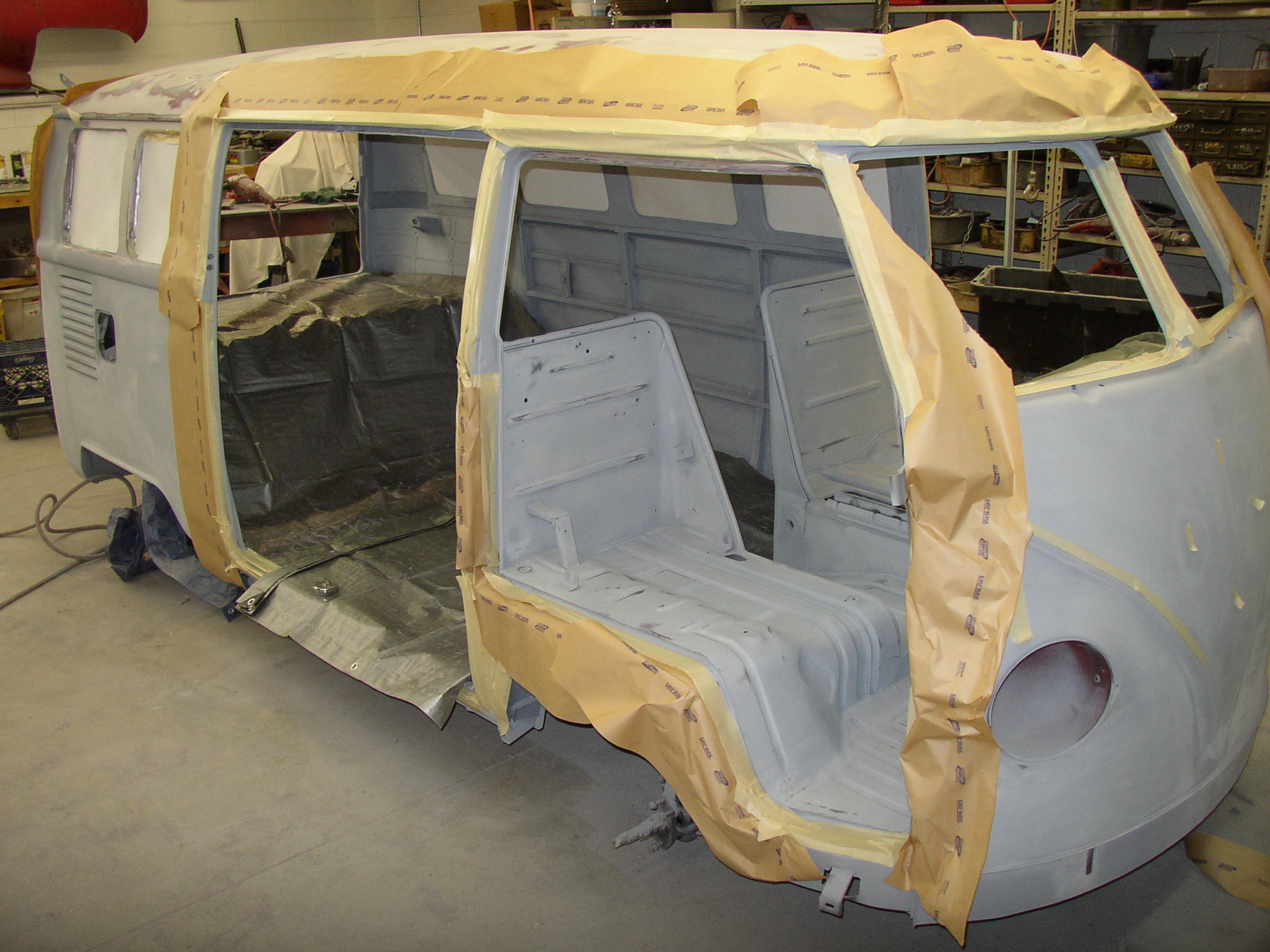 The idea is to shoot the inside of the roof with the 45* gun, then switch to the DeVilbiss gun and shoot the insides. Then pull the tarps and shoot the floor before finally unmasking the dashboard (to protect it from overspray and drips) and shoot it last. I also shot the white parts of the jambs so they will blend easier when shooting the exterior. I also did the funny "eyebrow" area over the windshields where the screens are as this will be tough later on.