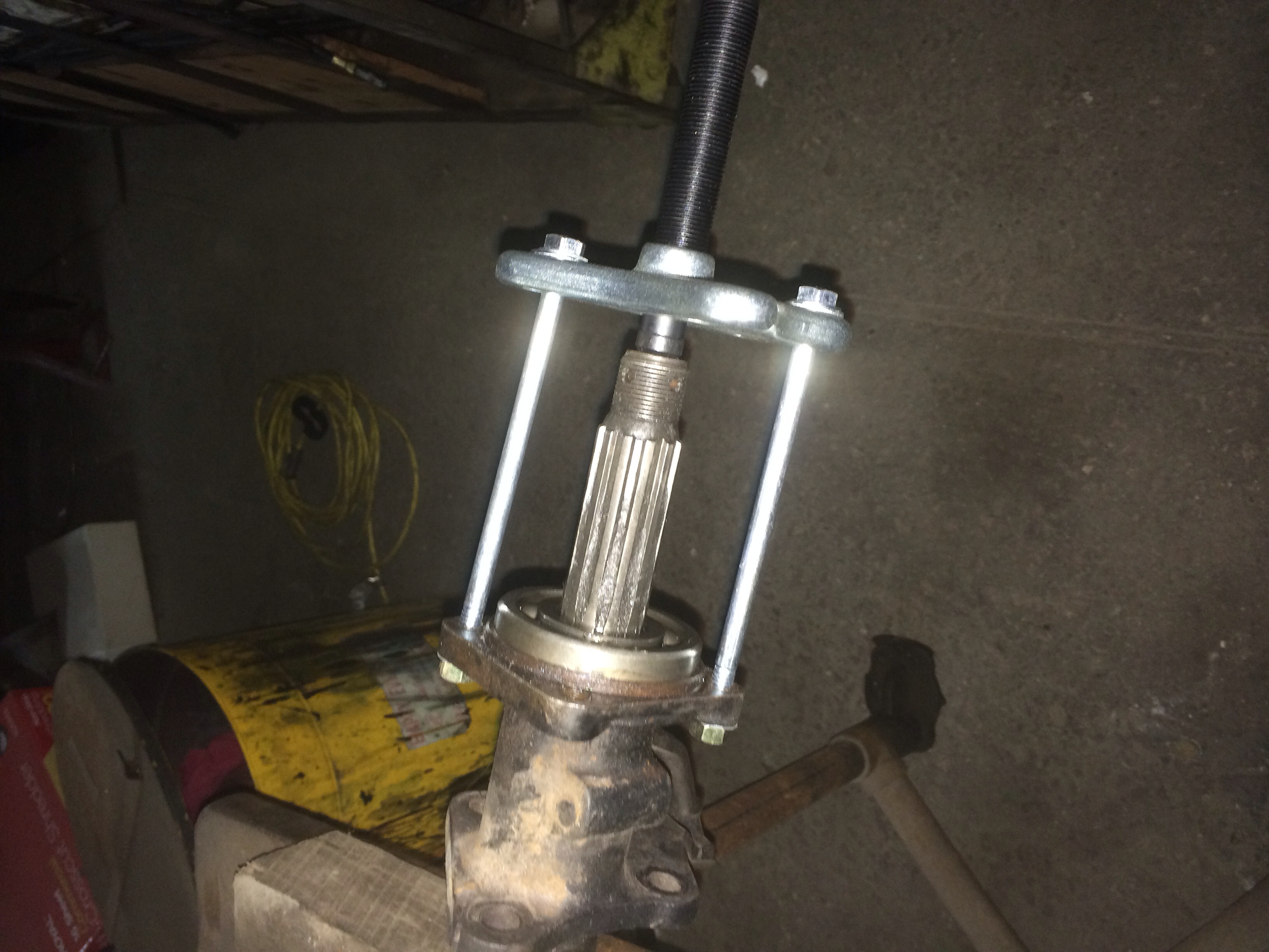 So do to several work projects I haven't been working on the bus much but I have a little break now so I got cracking again. I decided to hold off on the new wiring harness until i get the bus back on 4 wheels. So with the new goal of getting 4 wheels on I started by pulling the stock beam off and installing the new W5 beam. Next I just wanted quickly prep the straight axle trans to be put in with a few new gaskets, bearings, and a quick parts inspection. I bought a cheap universal puller from HF and it worked well to pull the bearing and axle tube off. Then I fought with those PITA snap rings that hold the axle into the diff for a few minutes and now I can start cleaning and painting things.