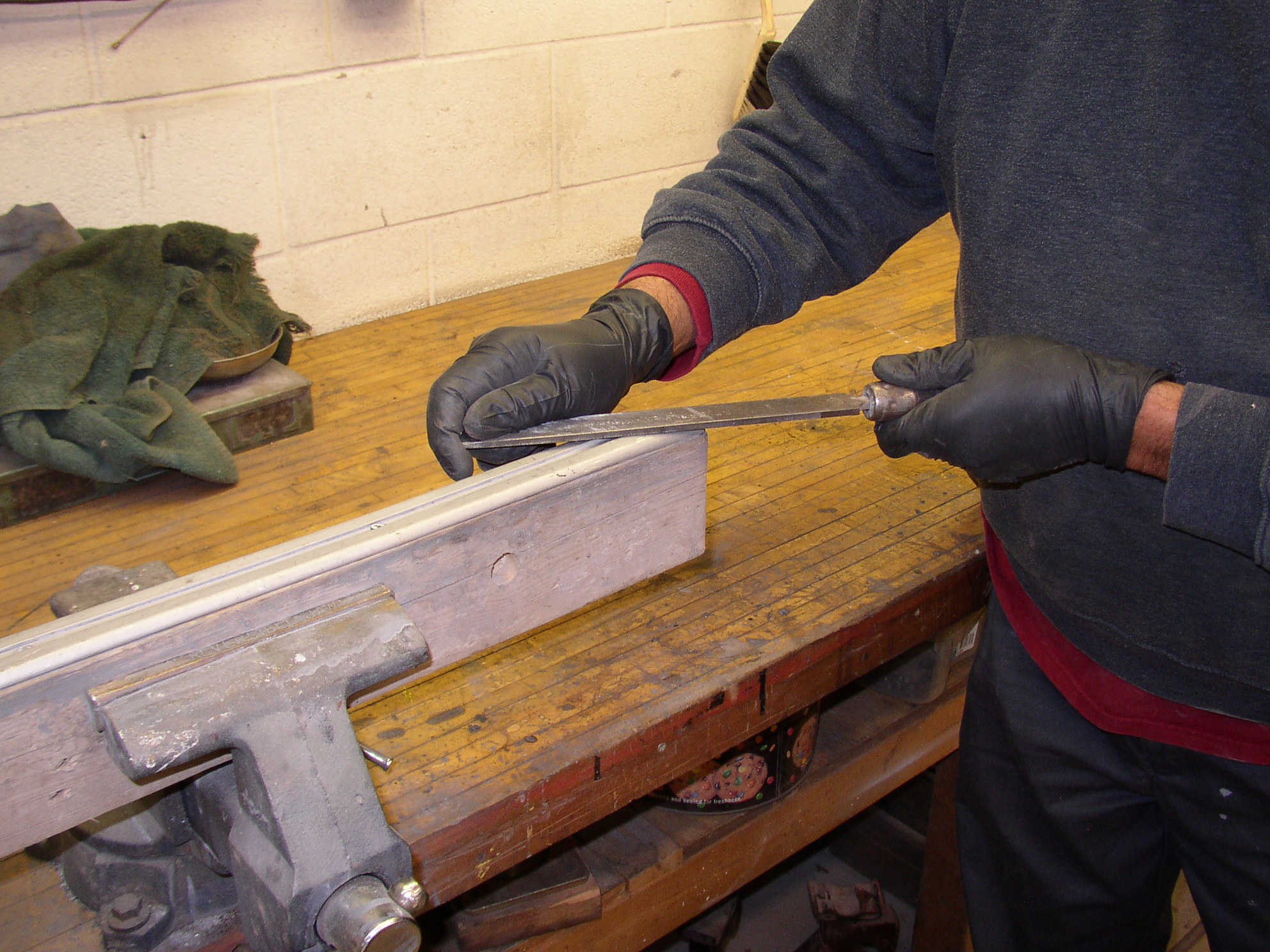 Then put a 2x4 in the vise and screw the piece to it with drywall screws. Be gentle, snug is fine, if you tighten the screw it will bend or kink the trim. Now take a file and smooth out any ripples or high spots.