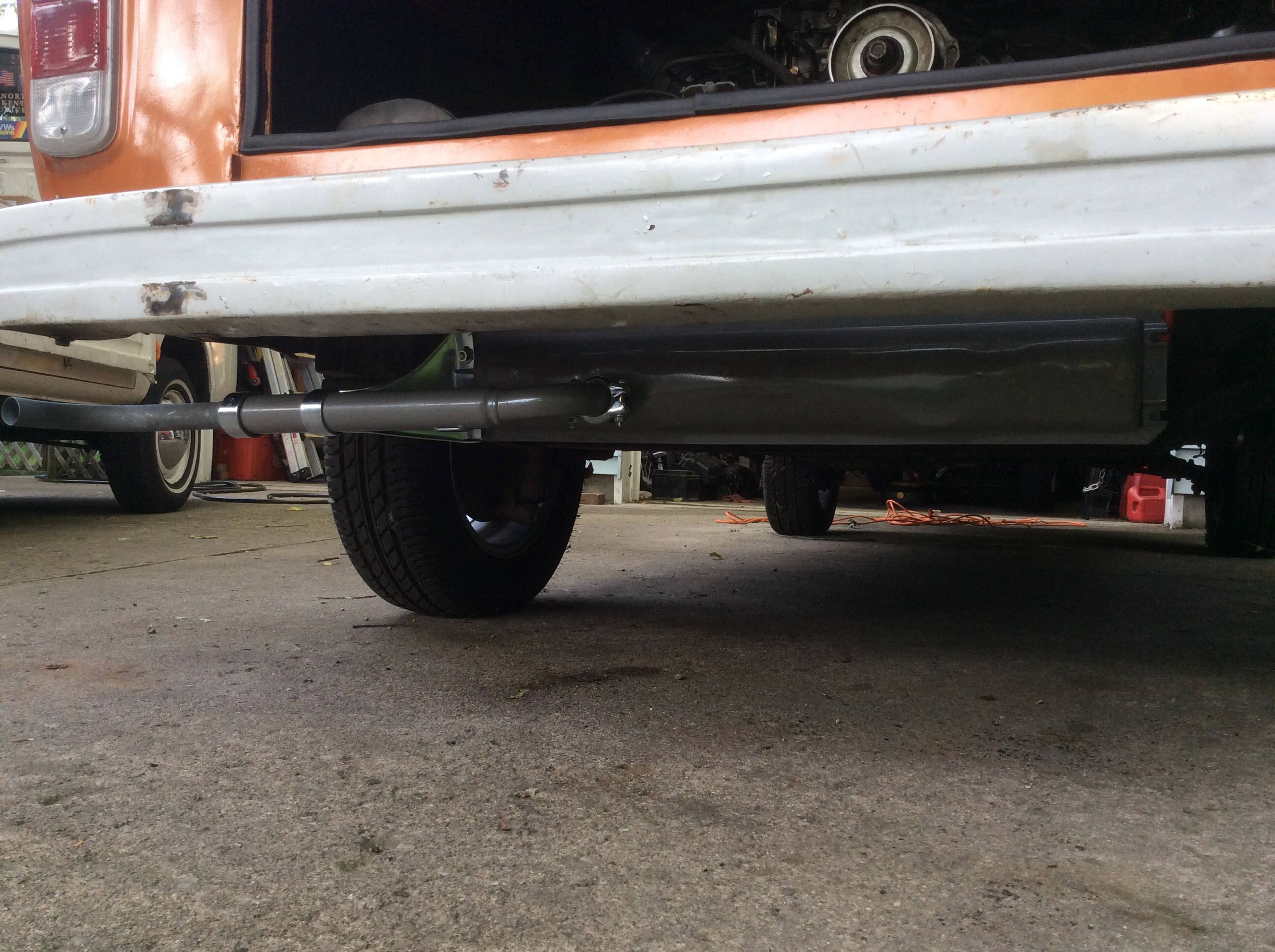 Test fit of the new muffler looked good. I was not 100% sure it would fit because none of the part catalogs listed this for a 74 Bus. Looks like everything will clear just fine.