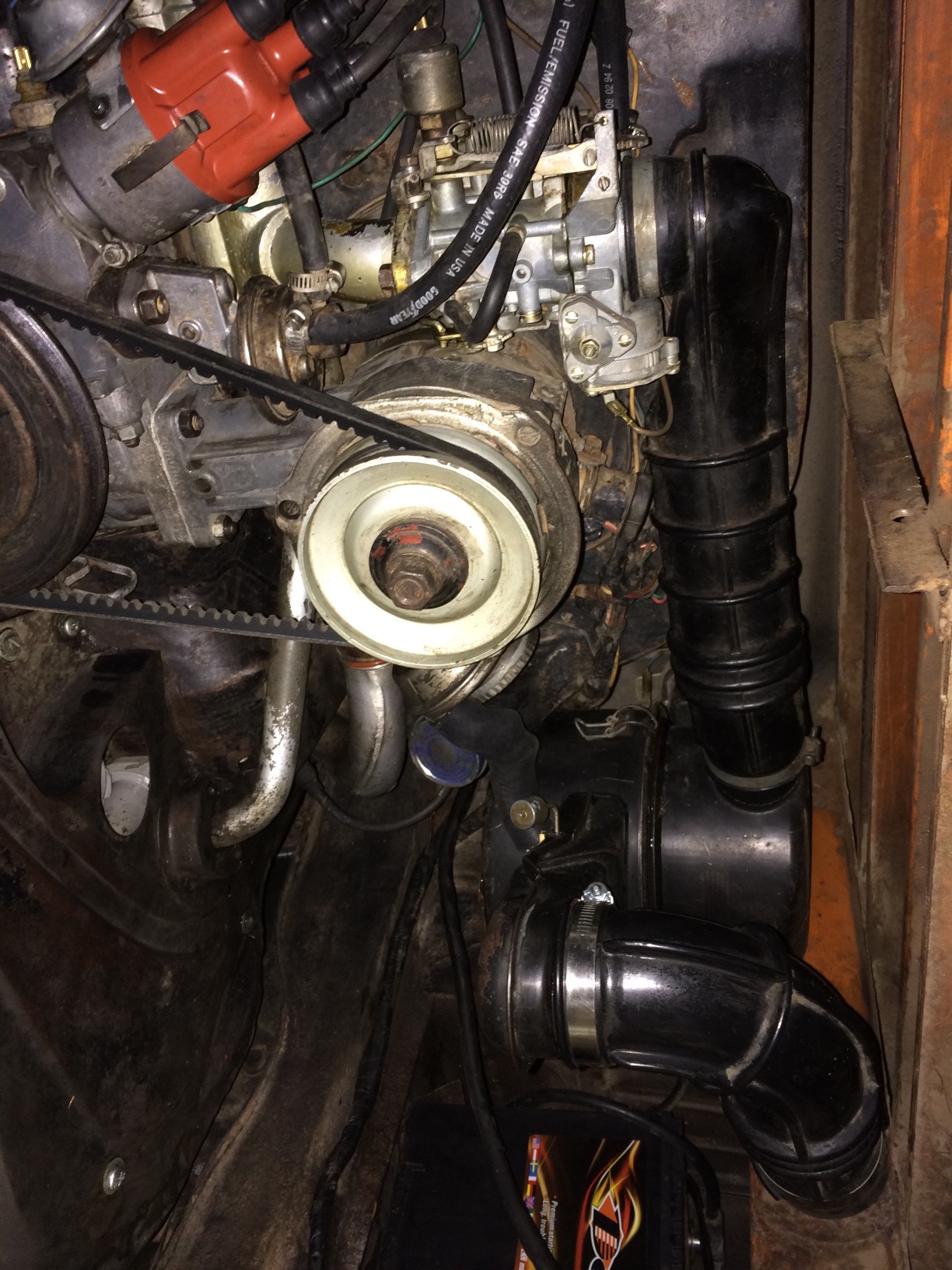 I worked on the engine this weekend, replaced the vacuum canister on the distributor, replaced and adjusted the points, replaced the spark plugs and plug wires. Replaced five of the studs for the oil drain plate. Waiting on a new metal fuel line to come in, currently it has a soft fuel line coming through the tin into the compartment. Repaired several wires to the coil, carb and alternator. Also replaced all the missing screws in the engine tin, it only had about half installed. I noticed that the large breastplate had trouble holding itself up level with the lip in the engine bay that the foam seal attaches to. At first I thought maybe the foam seal helps hold it up but that would still put a lot of stress on the tin and there is some stress cracking evident from years of flopping around. I found some additional holes that must have had brackets going to them and they lined up with the corners of the muffler. Searching online I could not find any photos online to confirm the actual existence of the brackets. At any rate I fabricated some simple brackets, used the tailpipe bracket bolt holding slots to attach them too and it seems to work well. My guess is when they made the muffler they did not reinstall the original brackets as the homemade muffler had nowhere to attach them too.