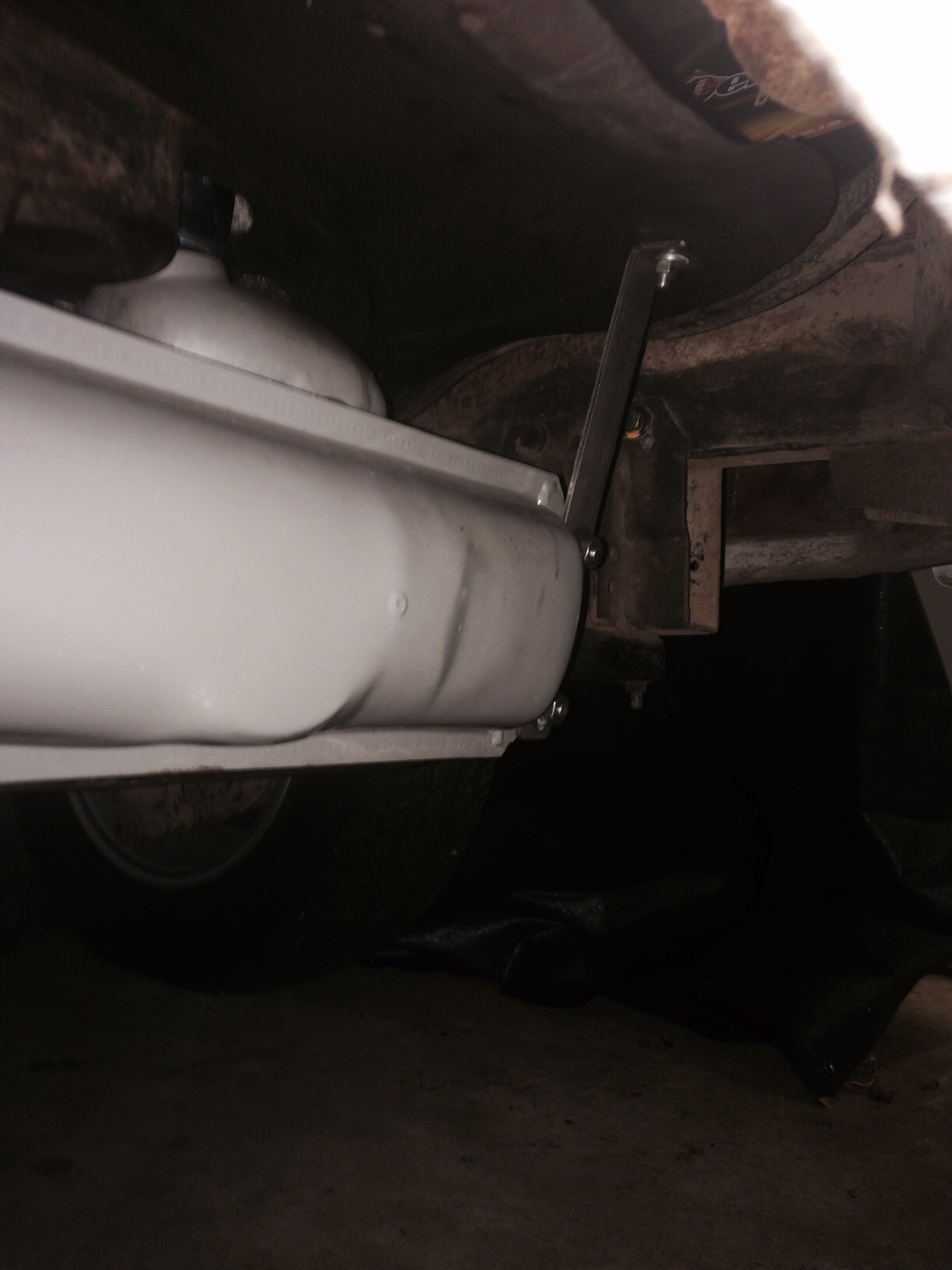 I was really interested to see the engine tin. The tin in my DC had been beat up over the years and required a bit of TLC. Looking at Chucks confirmed that I was not missing any tin, which is good because I understand it can be difficult to find. ( in metal at least). A lot of the screws were missing on mine so I replaced those and added some washers to provide a little added stability. I had hoped this would tighten up the tin, especially the rear piece, as it sagged well below the lip that supports the other side of the foam seal. Stress fractures and metal fatigue appear to have taken their toll over the years. I noticed two holes in the rear piece directly above the ends of the stock muffler. The stock muffler has a bracket on either side to attach the tail pipe to. This seemed to be a logical place to attach a support to lift the rear of the tin and keep it level with the foam seal lip. I know it is not stock but it does not look to bad and ended up working very well. I made the brackets out of steel and used stainless hardware to attach it to the muffler. Best of all I did not have to alter the muffler in anyway and was able to use holes already existing in the tin.