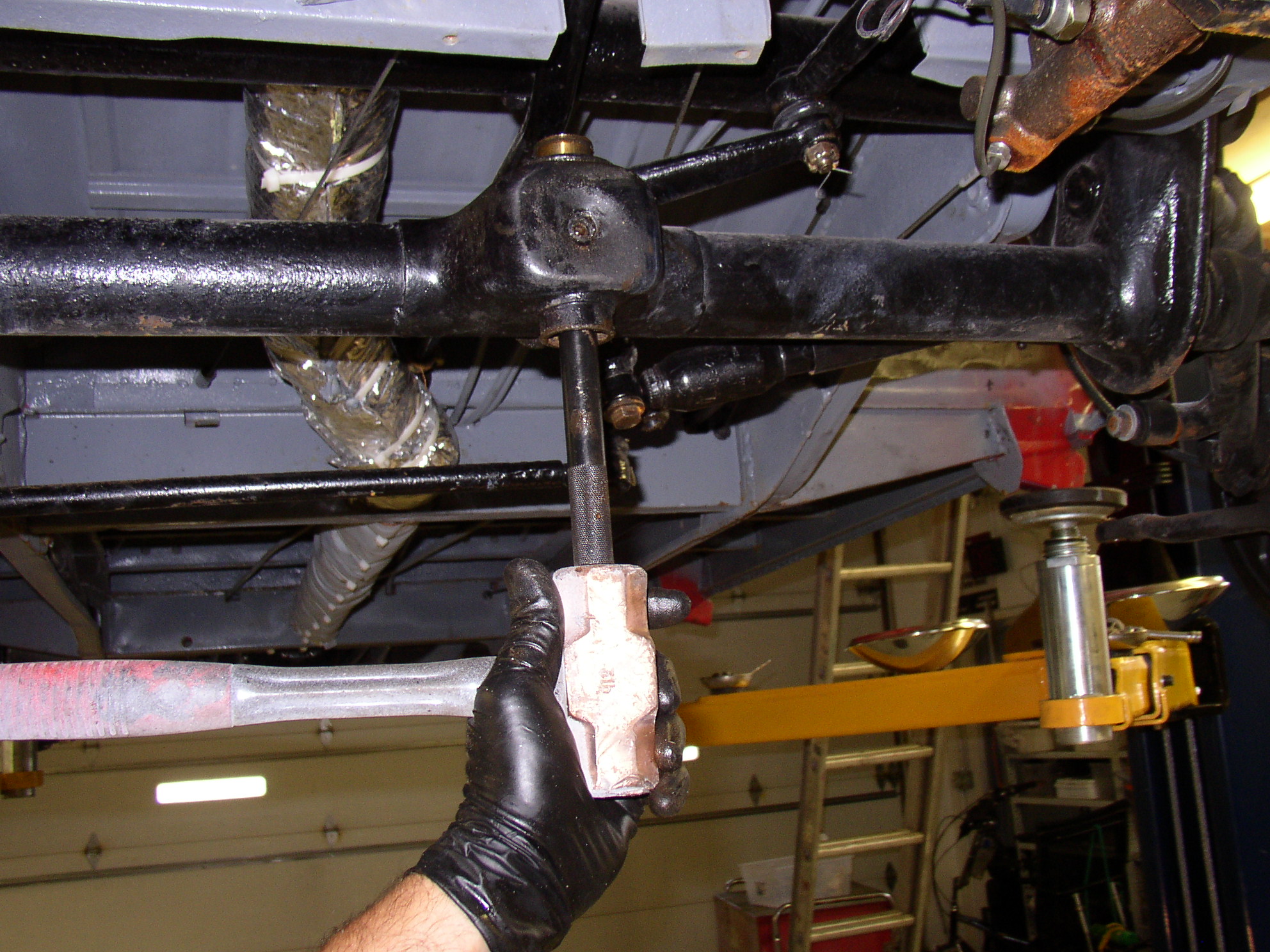 Undo the bolt lock, wrench the pinch bolt from the swing arm, remove it, and slide the arm off the top. Push it out of the way, tie rods and all, taking everything off of it is not needed. The shift tube is right overhead and looks like it will be in the way but it doesn't.