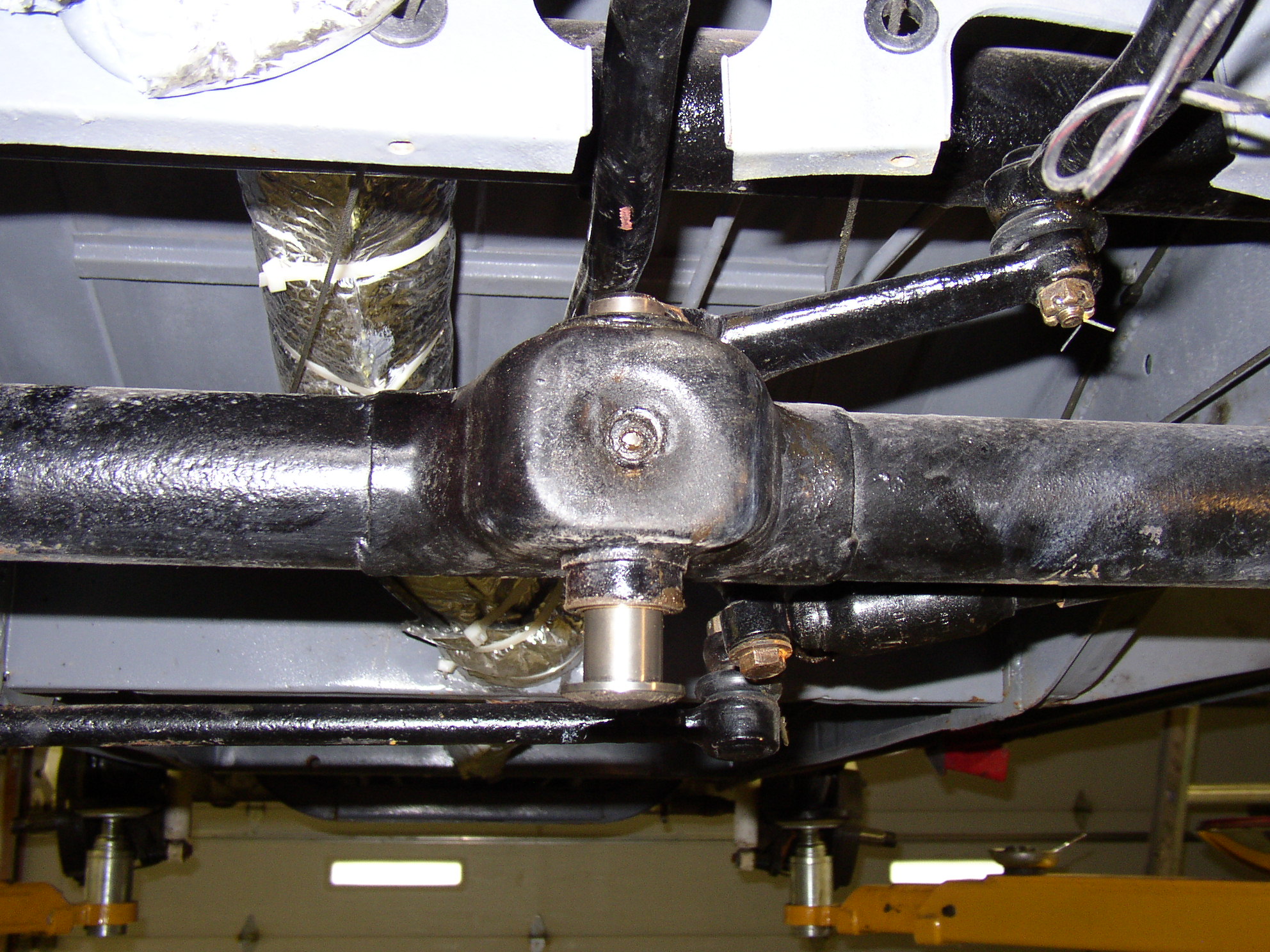 I "cheated" when I did the resto- the front end checked out as tight, so I cleaned it, painted it and figured I'd address any problems later. Well, later is here, and 3k miles proved the center pin to have a slight bit of slop in it along with one slightly sloppy tie rod end. Well, it's time to do the center pin. The Samba gang has a huge thread on this so I'll just post the details.