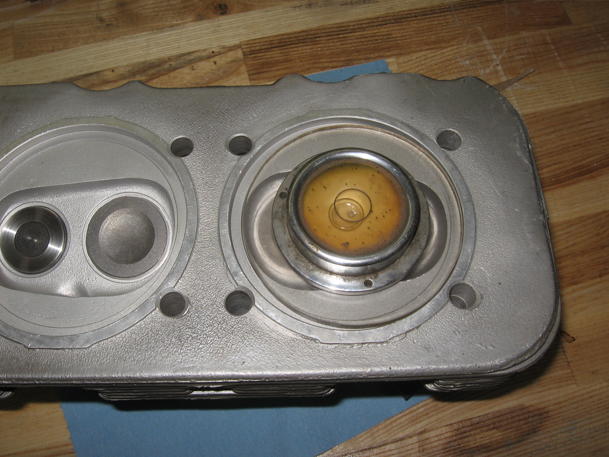 Normally these heads have about a 52cc -55cc volume. The 60cc is due to the step that is cast into the head's chamber. This was done on late air cooled Vanagon heads to replace the .030 shim originally used. This shim or metal gasket was later eliminated by VW tech bulletin to solve cylinder to head sealing problems. They did,however, want you to make up the difference with a thicker shim at the bottom of the cylinder at the case. Remember,this was the 80's. We did not have engine and fuel management systems and in order to meet U.S. emissions,most manufactures were lowering compression ratios in order to meet these standards. The trade off was a decrease in HP. The stock comp ratio on these motors is 7.1:1. We may be stuck with this. We'll see what we have when we mock up and take the rest of our measurements and see what we have. I really would like to see about 7.6:1.