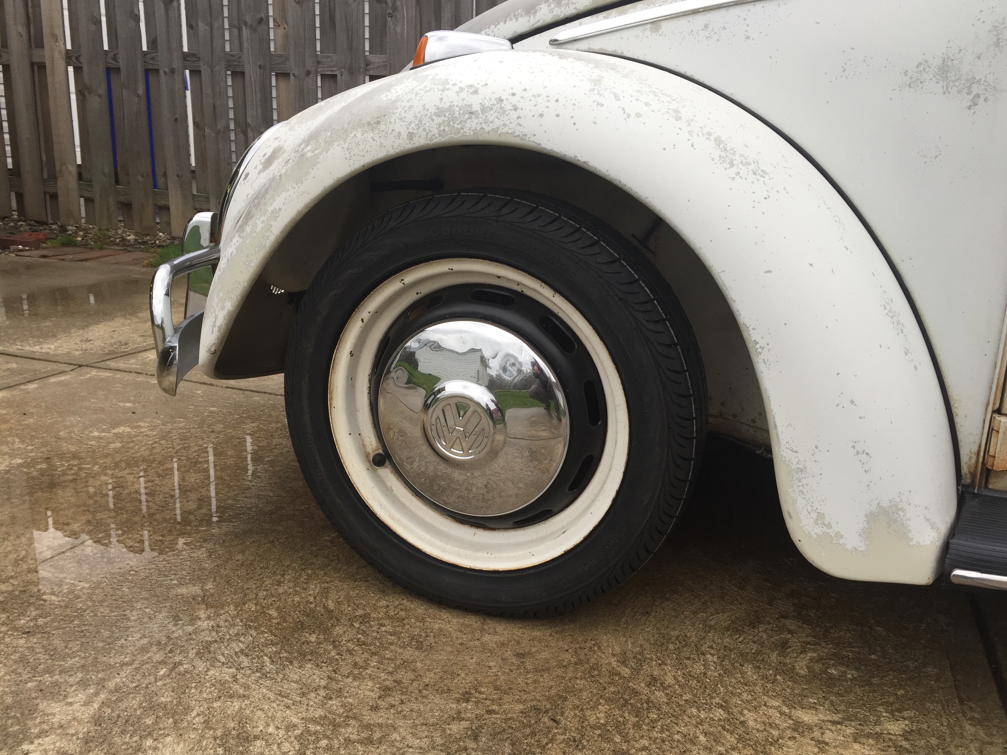 I decided to buy some tires that wouldn't rub the fenders under a sharp turn or a bump in the road. I had someone offer to "roll" the fenders but I wasn't sold on the fact that you should alter the fenders to make the tire fit. I went with a 155 65 15's Conti on the front. I had the rear tires mounted with the white walls in to match the front. The front tires are awesome and look pretty good too.