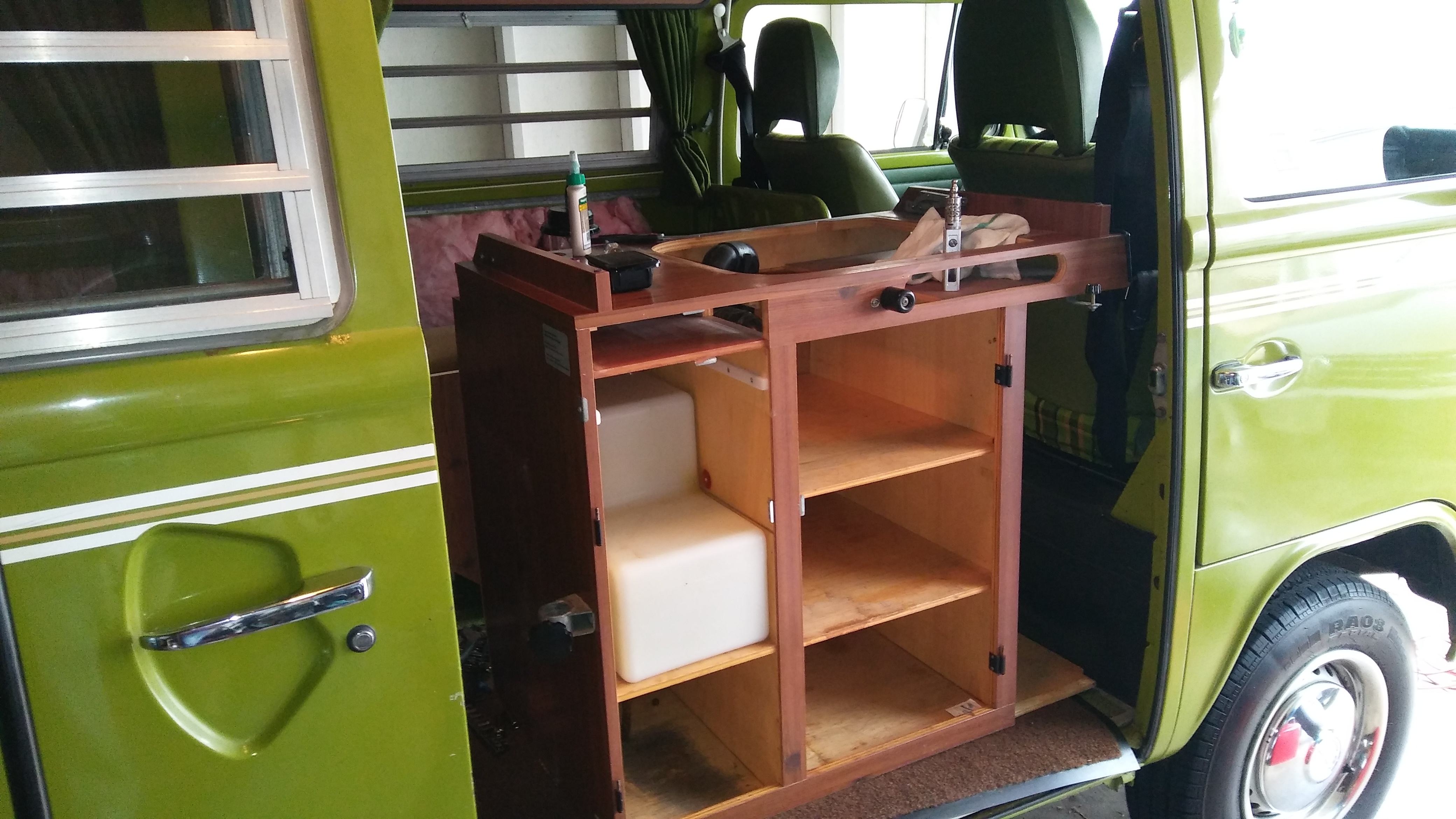 Big shout out to Josh for helping me place the sink/stove cabinet...couldn't have done it without you. Just waiting on the new sink pump. Now off with the bumpers and propane tank!