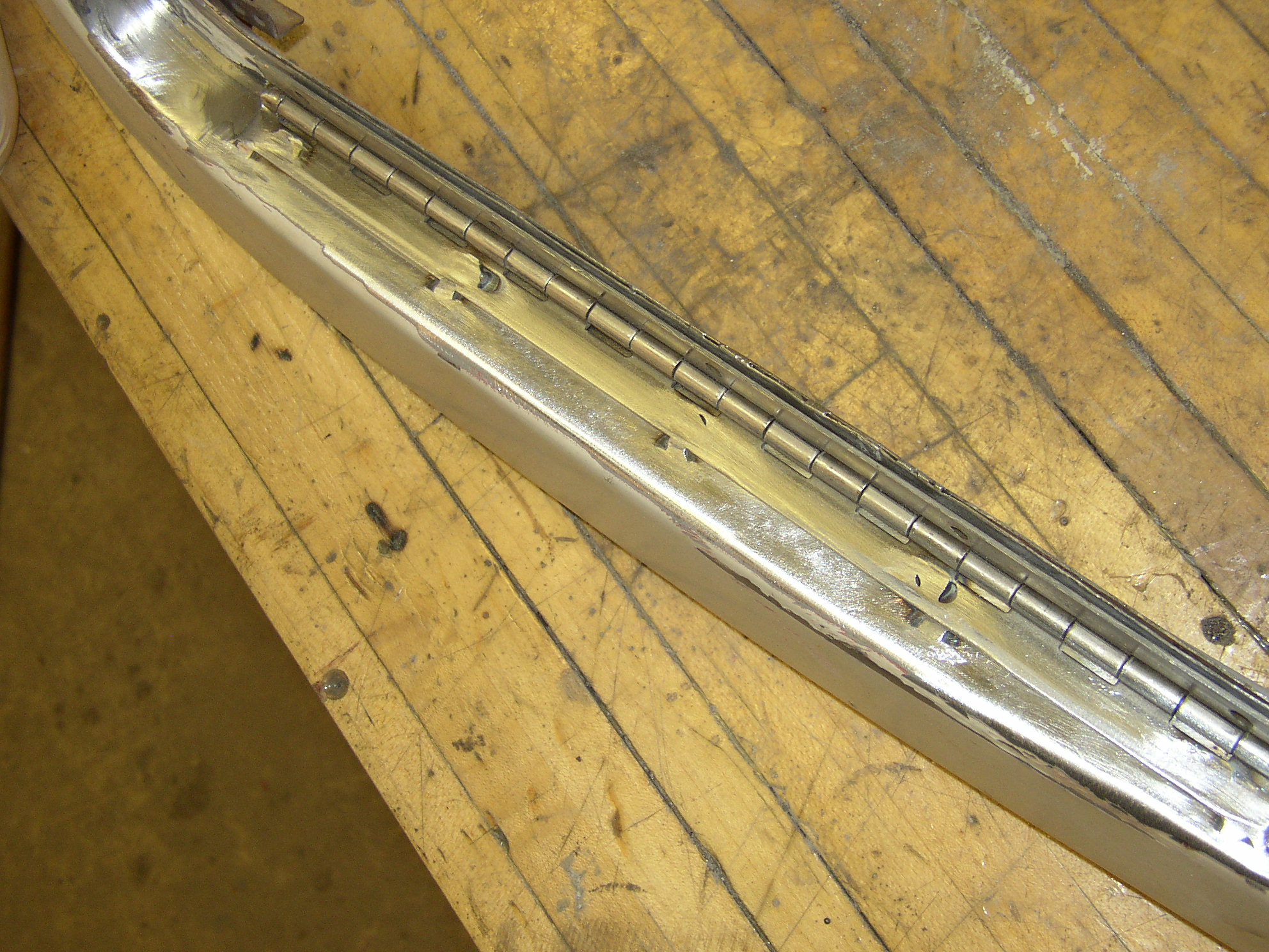 No sweat, grind it down, weld the holes up, grind it out, and work it smooth with a body hammer. I'll get a hinge from WW on my next order. And fill in the pits with "páte". This process is going to be repeated repeatedly.