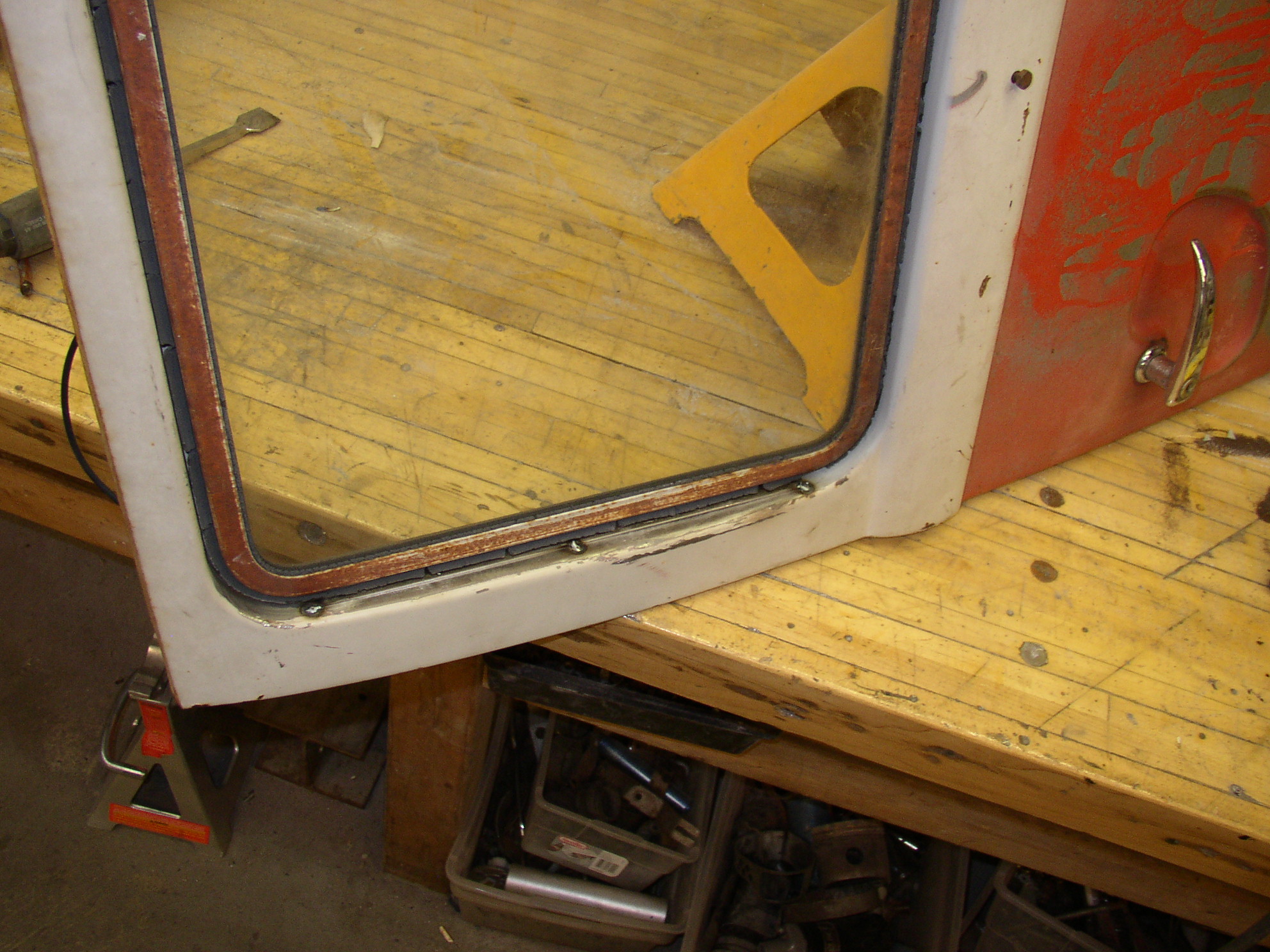 The front cargo door was a mess. Some moron in a previous life had torn the popout window hinge from the door and glued the whole f'ing window back into the door with some kind of high strength glue or epoxy. It took some real muscle and finesse to pry the window out without breaking the glass or doing massive damage, but in the process the window frame got twisted by the glue. There was no real solution for this as it came apart. The window frame was mucked up and needed pulling out but that's not easy.