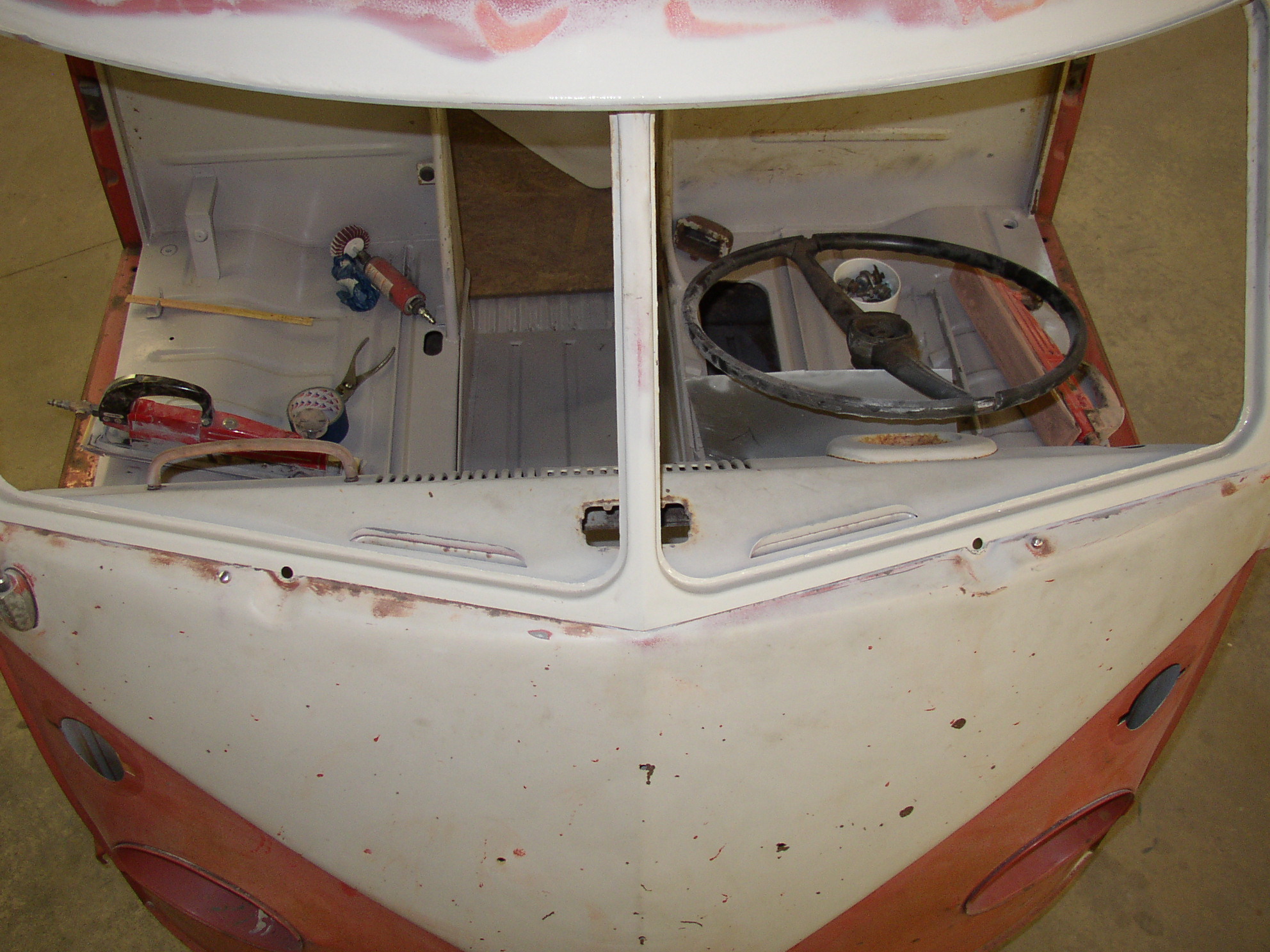 The decklid was a mess and I have a better one. I wanted to keep the one original to this bus but I didn't want to make a weeklong task of welding metal. It was only rotted in one place- just outboard of the glass area (not under the rubber, oddly enough) on the horizontal surface of the window ledge. Looking at it, I wonder if the Texas sun was reflecting off the glass at the right time of day and baking that particular area. The bottom of the decklid is beautiful, but just outboard of the glass it was severely pinholed. I took the shortcut route- sandblast it really well, epoxy up the pinholes, (Swiss cheese), and prep/paint. It actually came out much better than I anticipated. I tried (unsuccessfully) to remove some of the graffiti. I ended up removing as much OE paint as spray can. :roll: