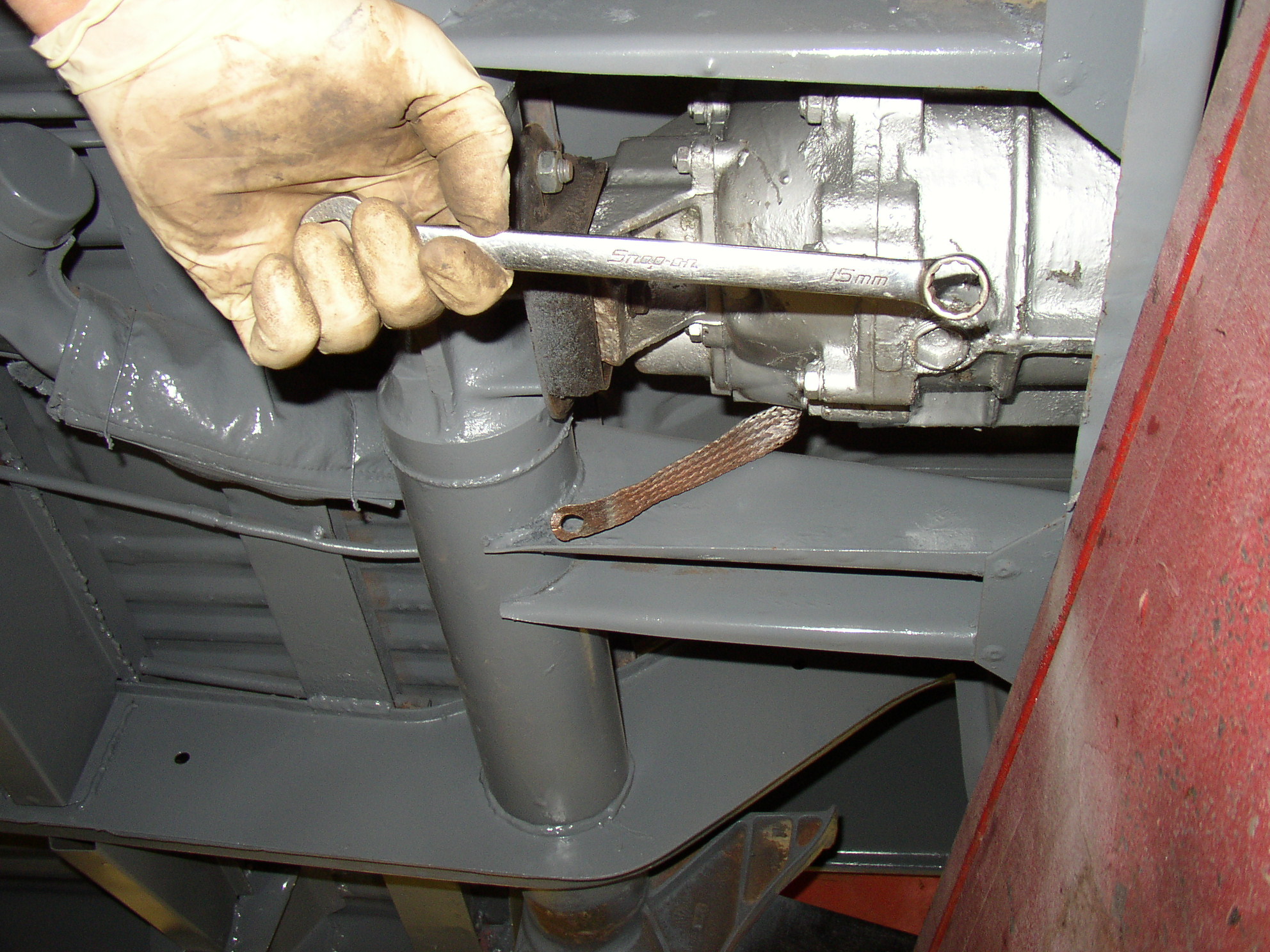 There's a sequence that's kind of important, if you screwed it up really bad you could break something. First, I put the rear mounts on the bellhousing, but leave the 4 8mm bolts/nuts loose. Note the Bowden tube is in place, it's easier now than later. Stick the whole assembly up and in, line it up and pull it into the forward mount. This is where I need the two special nuts- they're 10x1.5, but have a 15mm hex rather than the normal 17mm hex to clear the nosecone. I also need a skinny box wrench, this is where I go for the good Snappy wrench instead of the normal DD wrenches. I put the nuts on and bring them down, but not tight yet. Leave them relaxed so the nose can move around in them if needed. Put the two monster bolts in the frame horn and tighten them. Now, make sure the case is level, I eyeball it, but you could use a level if you're geometrically challenged. The tranny needs to be level in the body for two reasons- first the engine looks stupid if it's setting at an angle. Second, your shifter might be wonky if the tranny isn't level. Now tighten the rear mount bolts/nuts, notice they're still loose in this picture. Then go back and put the final torque on the funny 15mm nuts up front.