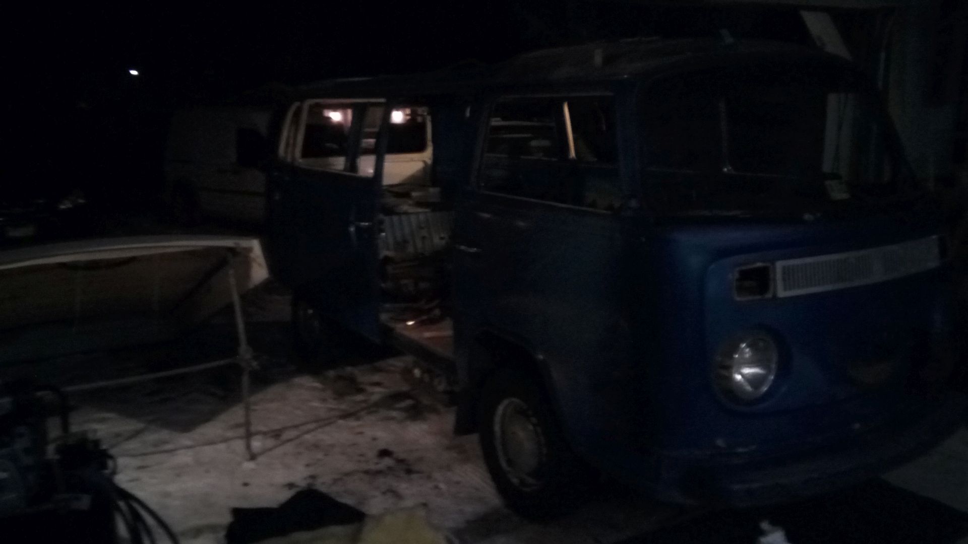Its' 1AM and freezing cold again, but I got the pop top off and laying in my driveway. Lifting it off the bus was a pain in the neck. I lost a hinge circlip in the process.