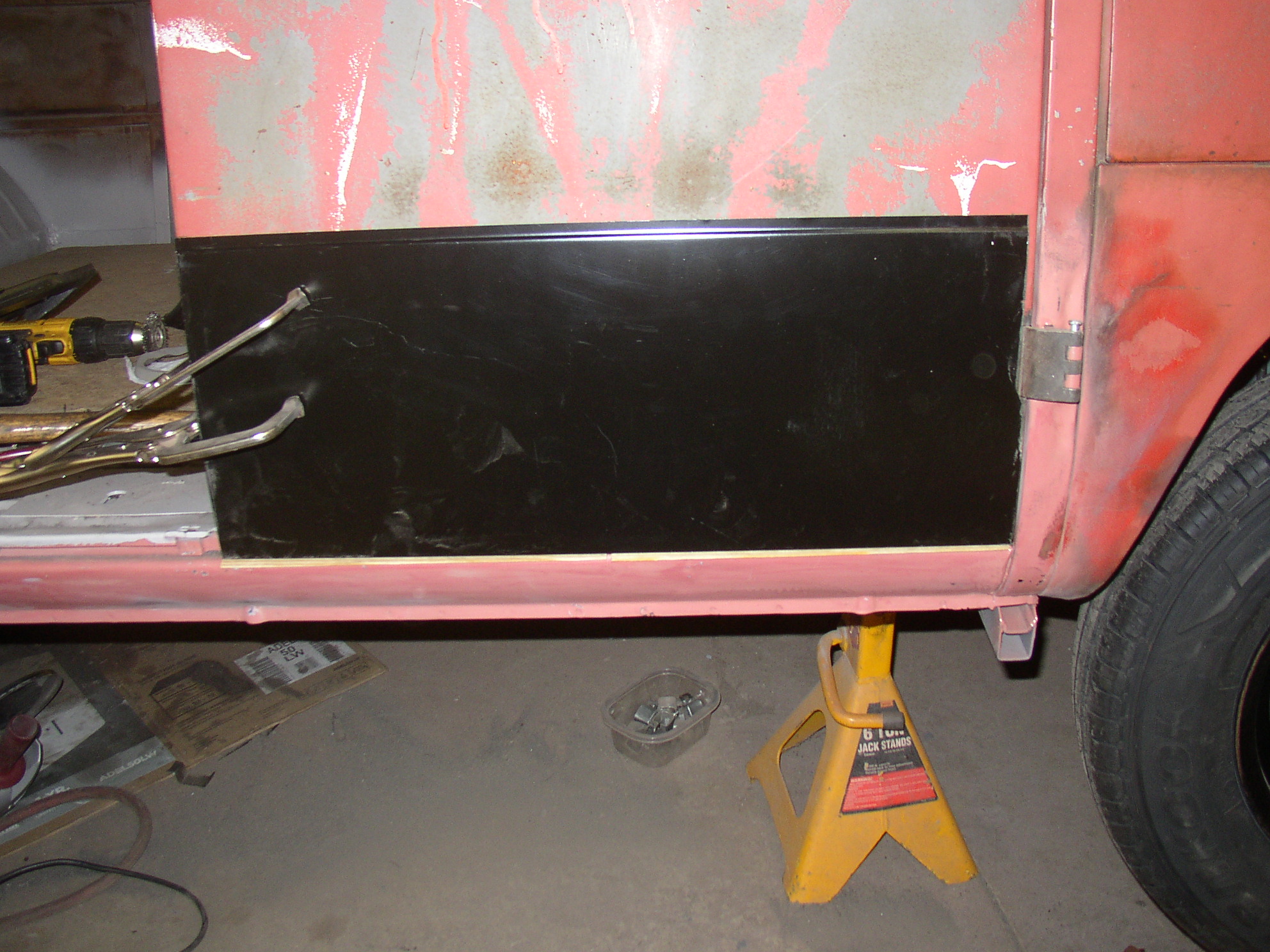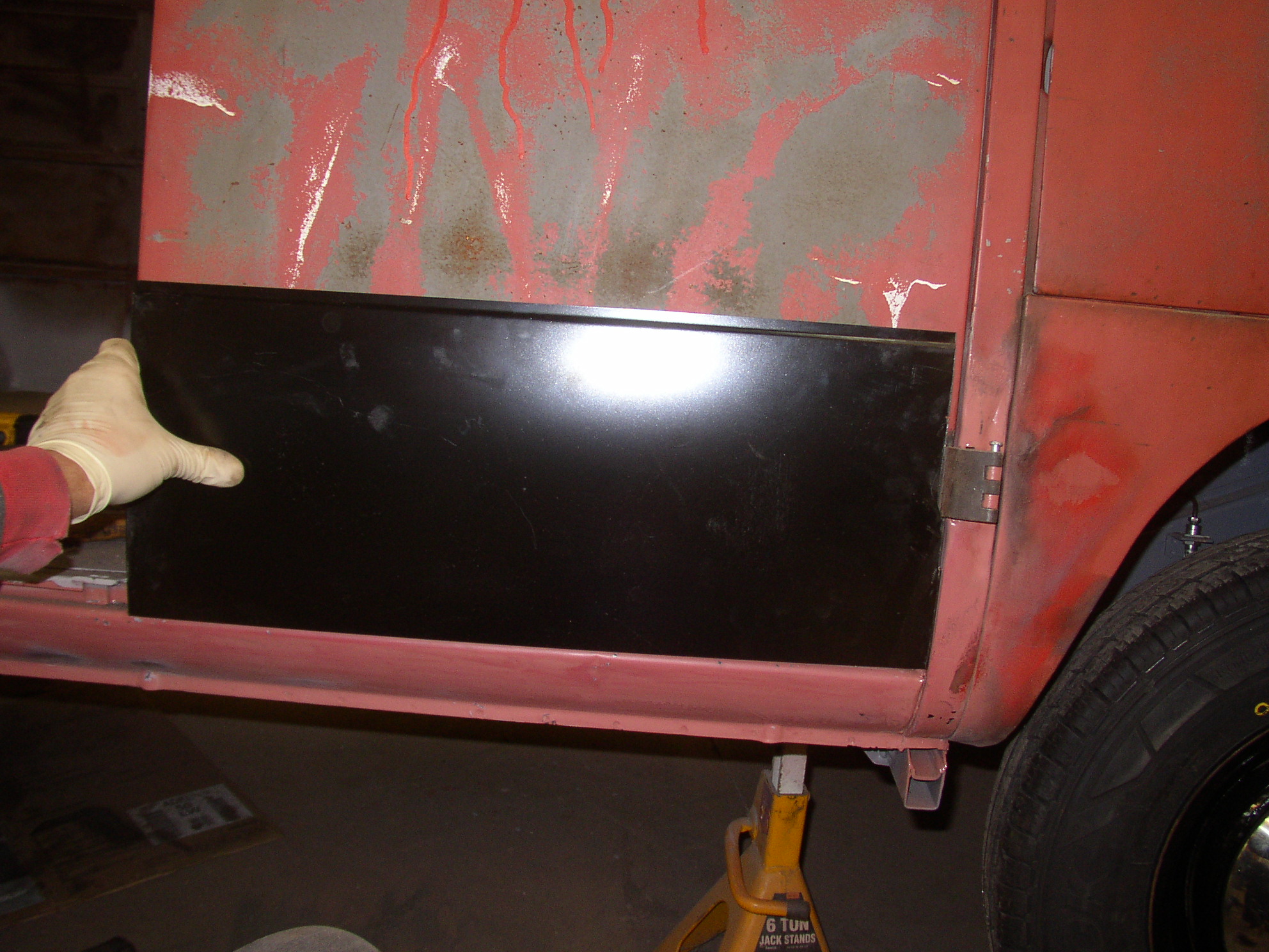 Until you put the lock rod in. Notice the panel is now too far out at the end by the lock rod and the rocker edge disappears. This is going to need some work. I had this issue on Bus 1 also and saw it too late, I ended up cutting the latch plate out of the floor, moving it inboard about 5/8" and re-welding it. I know this is not an unusual problem as I started looking closer at other restored busses and it's not unusual to see the cargo doors "pooched" out at the bottom center where they meet. :roll: It's some kind of production tolerance on the aftermarket parts- they look identical to the OEG but they don't fit right.