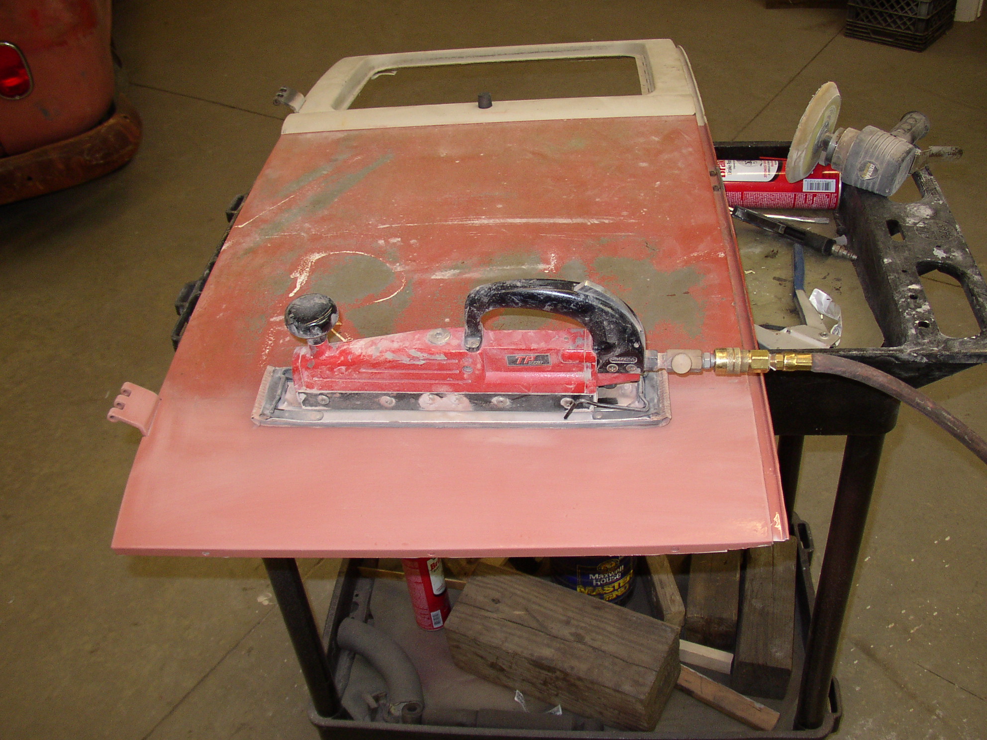 I figured it would be easier off the bus so I popped the pins and worked on a cart. More mud, then 36 grit on an air file.
