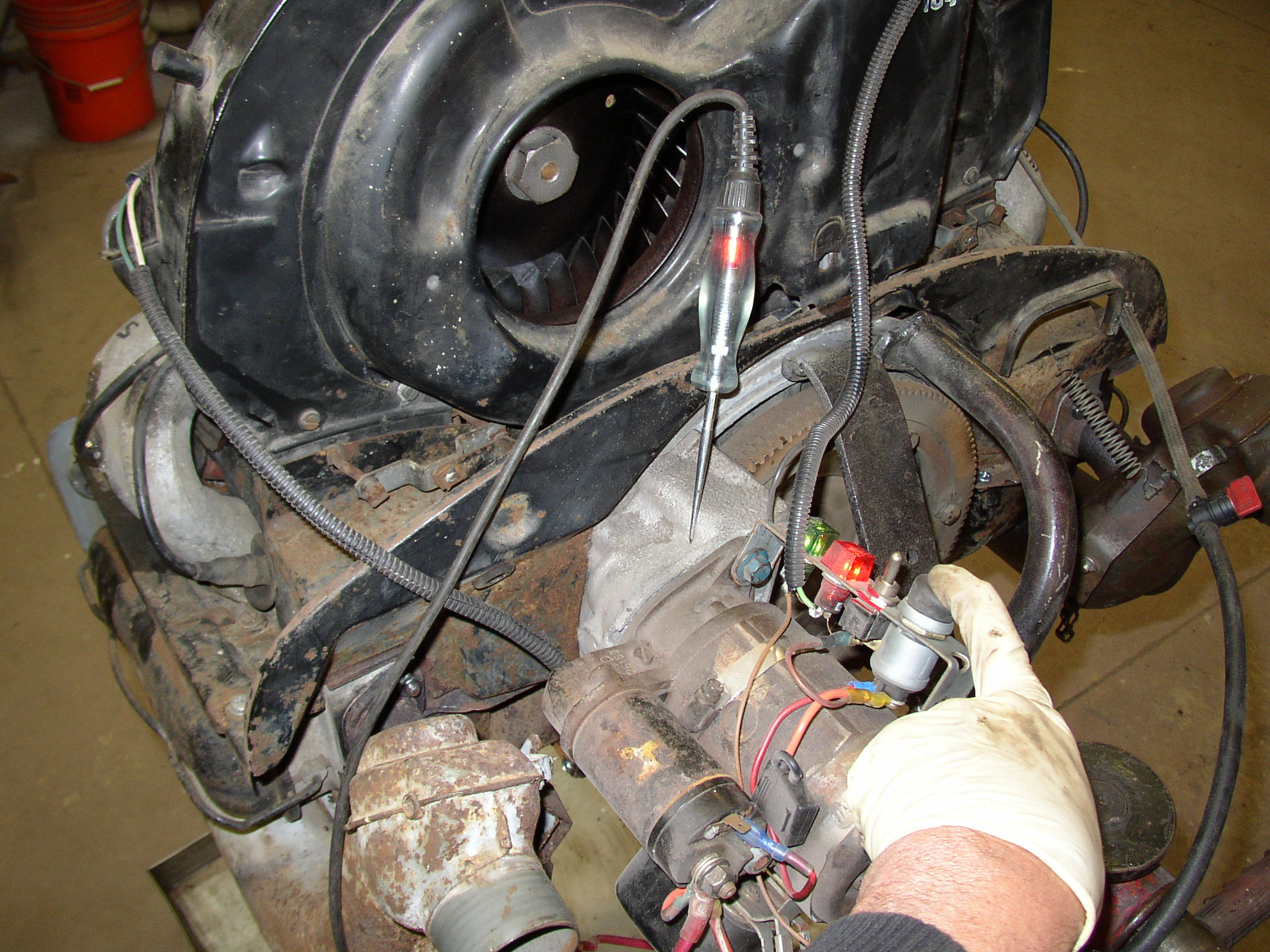 By all outside indicators, this looks like a really nice virgin low mileage engine. Throttle shaft is tight in the carb, almost all original components, nice end play and no vertical movement in the flywheel. Good compression (135-145) across all 4, runs good with no noises and starts right up. I have high hopes for this as a spare engine. I bought it at a garage sale from a widow whose husband was going to build a kit car but died first. I'm thinking I got lucky on this one. Fan hub was broken, no big deal. '74 AH case. Strip it down to retrim it to a generator setup and make sure the fins are clean. Cut the EGR flange off the intake manifold. Run a 3/8" tap into the hole, bottom a 3/8" bolt into it, cut it flush with a whizzer and grind it smooth. I don't know how you guys get stuck gen pulleys off but here's how I do it- weld a homemade puller onto the pulley and burp it loose. You can cut the puller from the pulley and re-use it with a bit of grinding, that surface is not used when in operation. Here's something bizarre when it was on the run stand- the bellhousing adapter is bolted tight but not grounded! Ted would call this a voltage drop of 12v when it should be under .1v