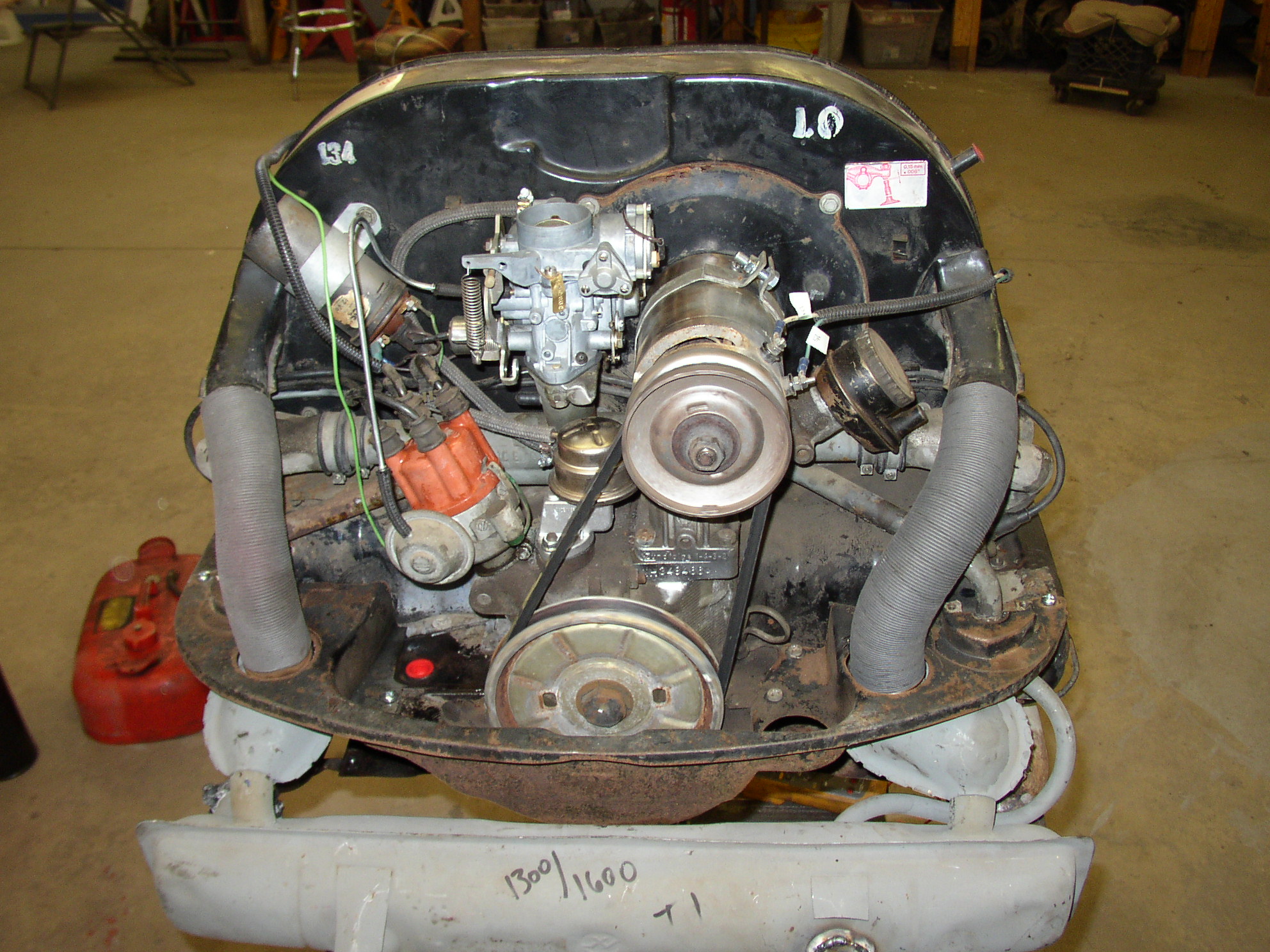 By all outside indicators, this looks like a really nice virgin low mileage engine. Throttle shaft is tight in the carb, almost all original components, nice end play and no vertical movement in the flywheel. Good compression (135-145) across all 4, runs good with no noises and starts right up. I have high hopes for this as a spare engine. I bought it at a garage sale from a widow whose husband was going to build a kit car but died first. I'm thinking I got lucky on this one. Fan hub was broken, no big deal. '74 AH case. Strip it down to retrim it to a generator setup and make sure the fins are clean. Cut the EGR flange off the intake manifold. Run a 3/8" tap into the hole, bottom a 3/8" bolt into it, cut it flush with a whizzer and grind it smooth. I don't know how you guys get stuck gen pulleys off but here's how I do it- weld a homemade puller onto the pulley and burp it loose. You can cut the puller from the pulley and re-use it with a bit of grinding, that surface is not used when in operation. Here's something bizarre when it was on the run stand- the bellhousing adapter is bolted tight but not grounded! Ted would call this a voltage drop of 12v when it should be under .1v