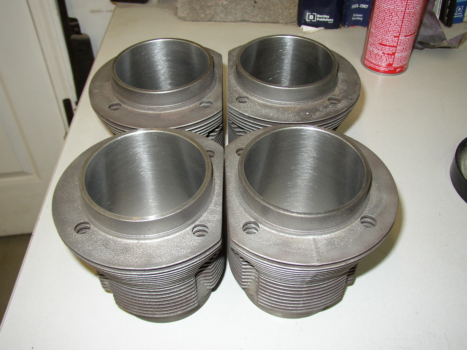 Once they're honed and look nice, check for wear, taper, and egg-shape, amazingly these check out like brand new- zero" of those. Once that's done, bead blast the fins to get rid of rust and dirt. Soda blast the Mahle pistons. Weigh them, they're all within 1.5 grams. Disassemble the heads, put new exhaust valves in, lap them, check them with Prussian blue dye. I bet this tube of dye is older than some LeakOilers. Check for leakage and an intake leaks, so off to the machine shop they go.