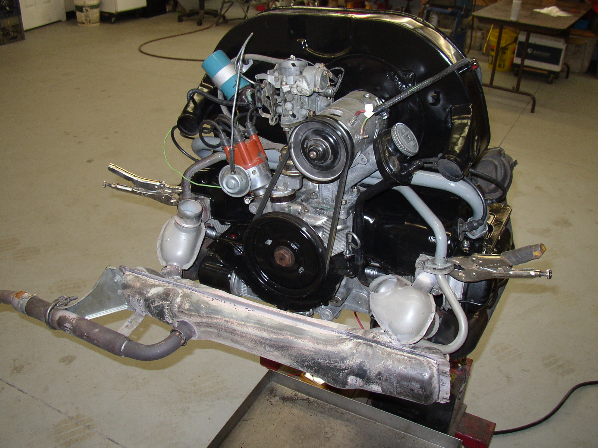 Here's the short block done, it spins freely with zero effort. I've been drilling an extra drain hole in the case to relieve pressure on the rear seal, the hole should be at 6 o'clock and the Germans put it at 8 o'clock for some reason. This leaves an ounce of oil against the lip of the seal when the car is parked and sometimes ends up on the driveway. The heads had less than 1000 miles since last ground, I disassembled them..... And blasted everything. I don't like the "valve grinding compounds" sold lately for lapping as they're too coarse and make little grooves in the valve face and seat, it's like sand in a paste carrier. I tried using rubbing compound this time and it worked great. (you can see a bit of it in the tub in the left background) I used a power drill running really slow and reversed directions a lot, maybe 2-3 seconds at a time and refreshed the compound. Parts done and ready to assemble, German jugs ball honed and checked, no wear or out-of-round measurable. Pistons soda blasted and re-ringed. Heads assembled and ready to go. I always air check heads as soon as they go on to make sure everything is air tight. The compound must have worked well as there was not a bit of leakage. Long block done. Oil system complete and priming, I was able to get 40psi cranking. Note the spark plugs and rocker shafts are off to relieve pressure, the engine spins very free like this to build oil pressure. You can see the "4" written on top of the piston and the notches in each jug to match- 4 notches on #4 jug, 3 on 3. I only use engine oil as an assembly lube, no fancy greases or assembly lubes. Runs perfect and great oil pressure, I use a really thin oil initially on the stand (like 0w-20) while the rings seat in for a few hours and then change to 0w-40 Mobil 1. I'm not finishing the sheet metal trim on this engine because I don't know what it's going into, that's why there's VGs on the heat riser pipes.