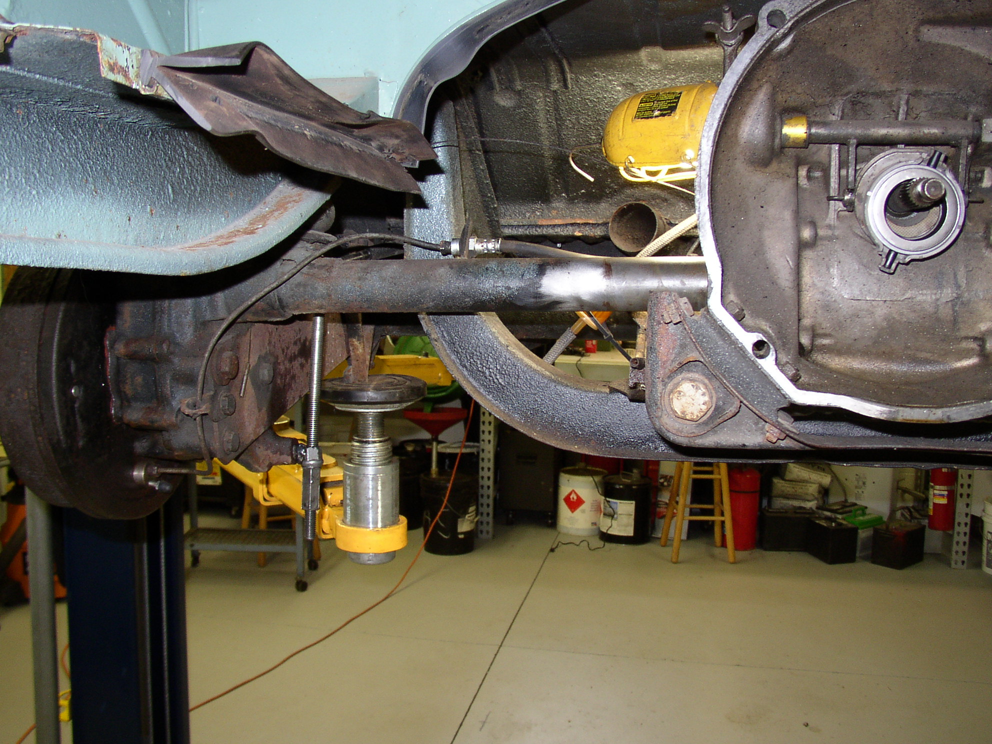 Replacing the torn axle boots requires leveling the axle with my homemade torsion bar compressor tool. Once again, keep hands and feet away from moving parts. If those welds break loose bad things happen and I'm not the best welder.