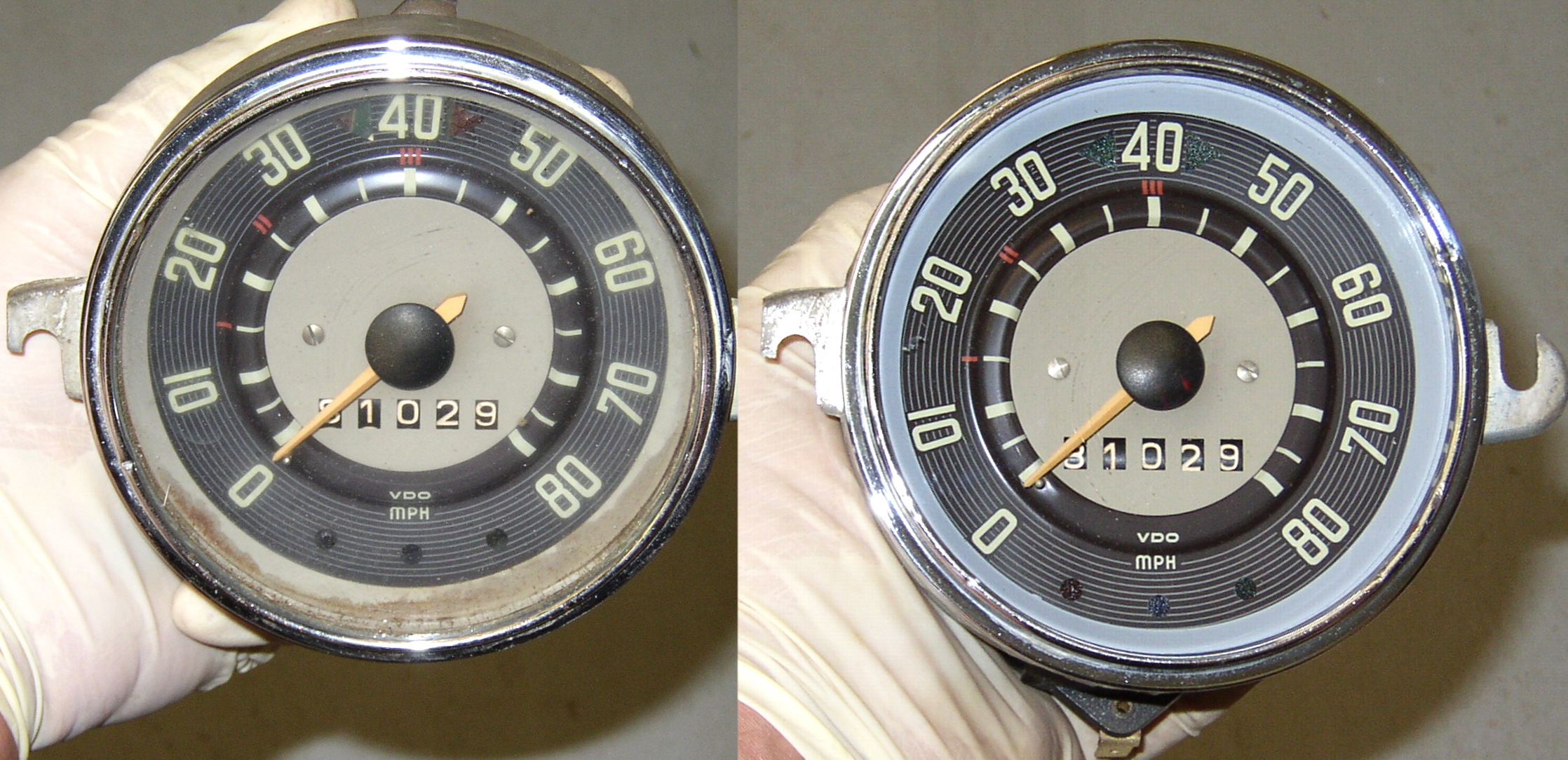 Meanwhile I was doing the speedo head, when I took it apart the colored gels fell out, which is pretty much normal. I bead blasted the can, buffed the chrome trim ring, cleaned things up and glued in new gels with weatherstrip adhesive.
