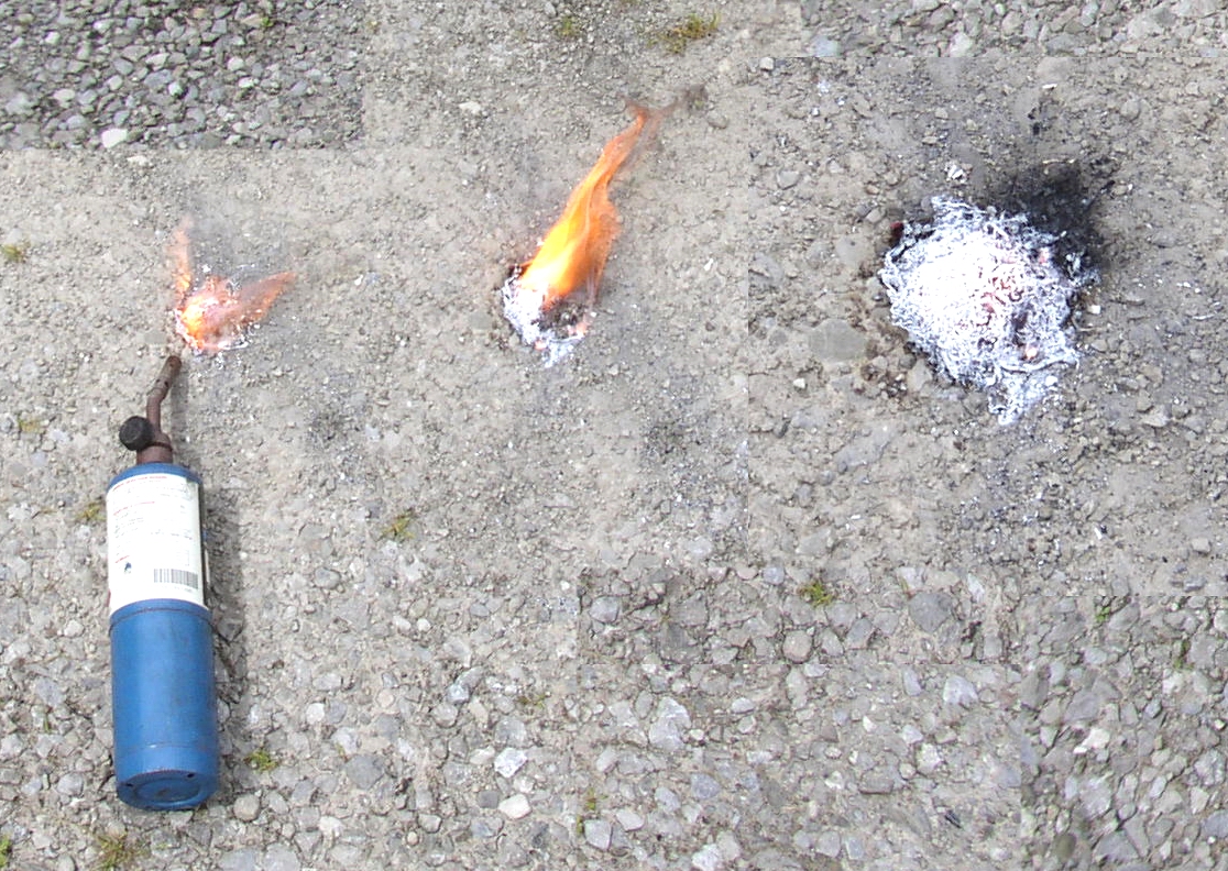 Hmmm, I can't remember if the trans is aluminum or magnesium, let's find out. Take a handful of shavings outside, and yes, it's magnesium. The propane tank is there for size comparison.