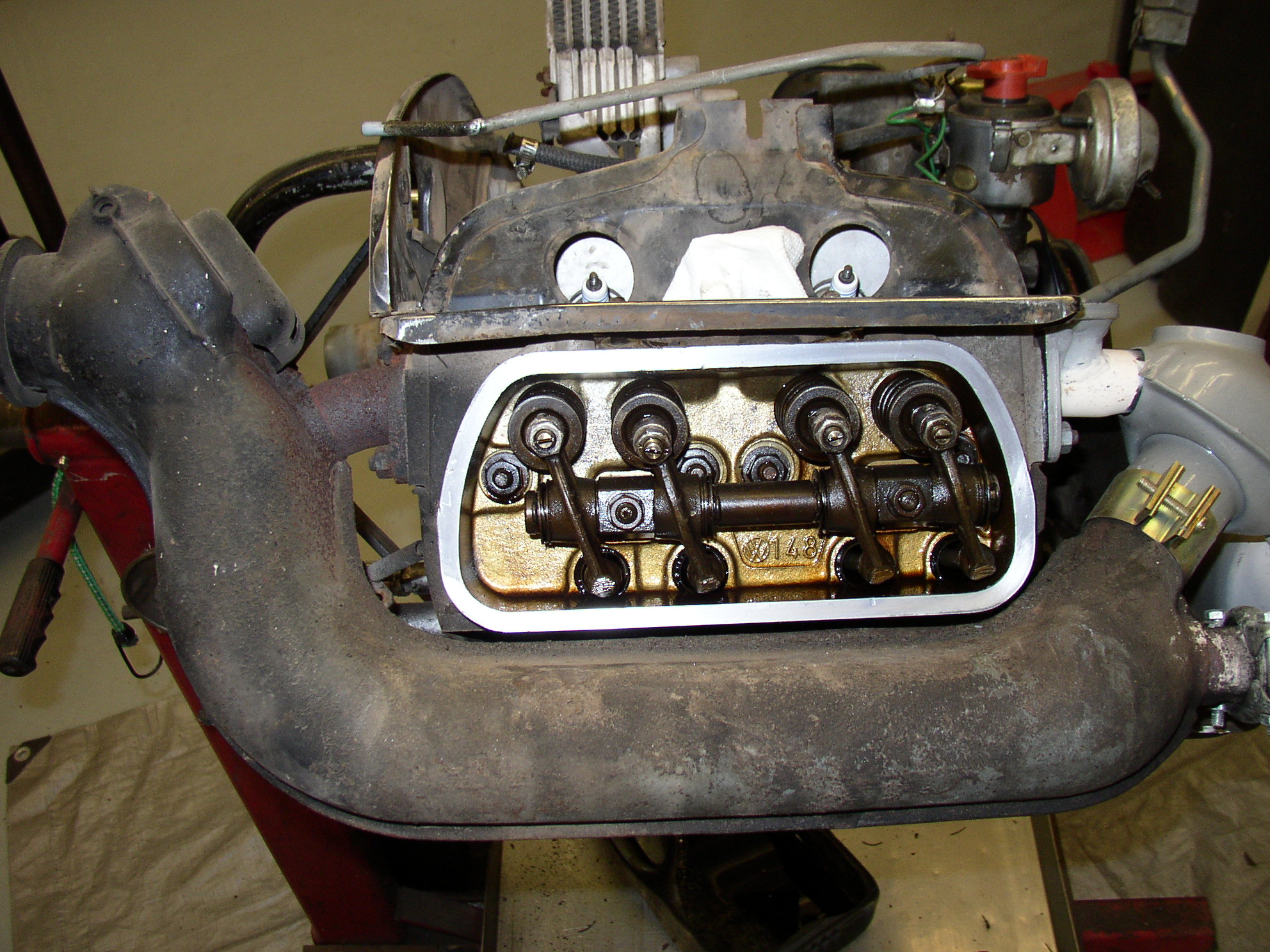 Here's the short block done, it spins freely with zero effort. I've been drilling an extra drain hole in the case to relieve pressure on the rear seal, the hole should be at 6 o'clock and the Germans put it at 8 o'clock for some reason. This leaves an ounce of oil against the lip of the seal when the car is parked and sometimes ends up on the driveway. The heads had less than 1000 miles since last ground, I disassembled them..... And blasted everything. I don't like the "valve grinding compounds" sold lately for lapping as they're too coarse and make little grooves in the valve face and seat, it's like sand in a paste carrier. I tried using rubbing compound this time and it worked great. (you can see a bit of it in the tub in the left background) I used a power drill running really slow and reversed directions a lot, maybe 2-3 seconds at a time and refreshed the compound. Parts done and ready to assemble, German jugs ball honed and checked, no wear or out-of-round measurable. Pistons soda blasted and re-ringed. Heads assembled and ready to go. I always air check heads as soon as they go on to make sure everything is air tight. The compound must have worked well as there was not a bit of leakage. Long block done. Oil system complete and priming, I was able to get 40psi cranking. Note the spark plugs and rocker shafts are off to relieve pressure, the engine spins very free like this to build oil pressure. You can see the "4" written on top of the piston and the notches in each jug to match- 4 notches on #4 jug, 3 on 3. I only use engine oil as an assembly lube, no fancy greases or assembly lubes. Runs perfect and great oil pressure, I use a really thin oil initially on the stand (like 0w-20) while the rings seat in for a few hours and then change to 0w-40 Mobil 1. I'm not finishing the sheet metal trim on this engine because I don't know what it's going into, that's why there's VGs on the heat riser pipes.
