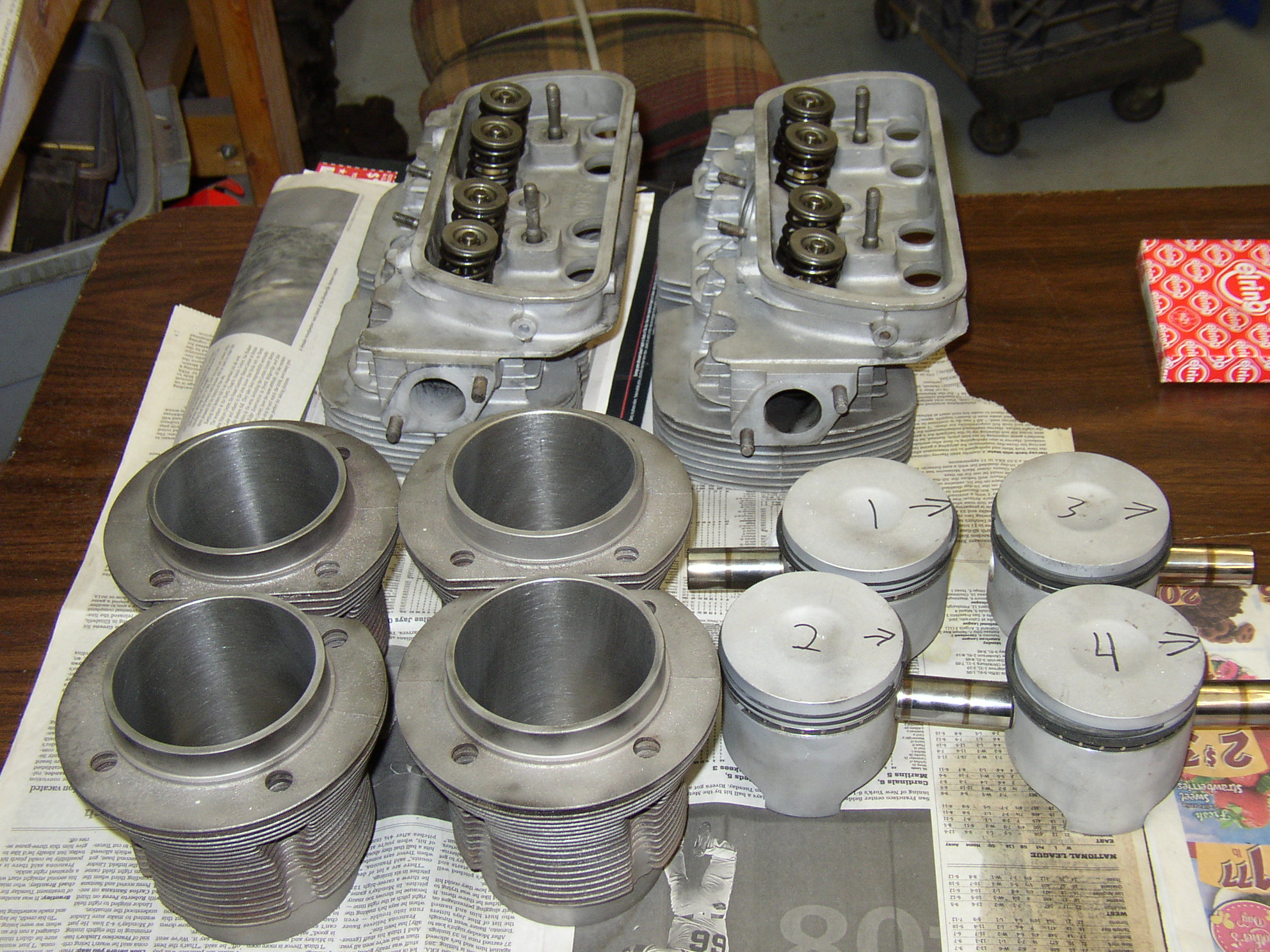 Parts done and ready to assemble, German jugs ball honed and checked, no wear or out-of-round measurable. Pistons soda blasted and re-ringed. Heads assembled and ready to go.