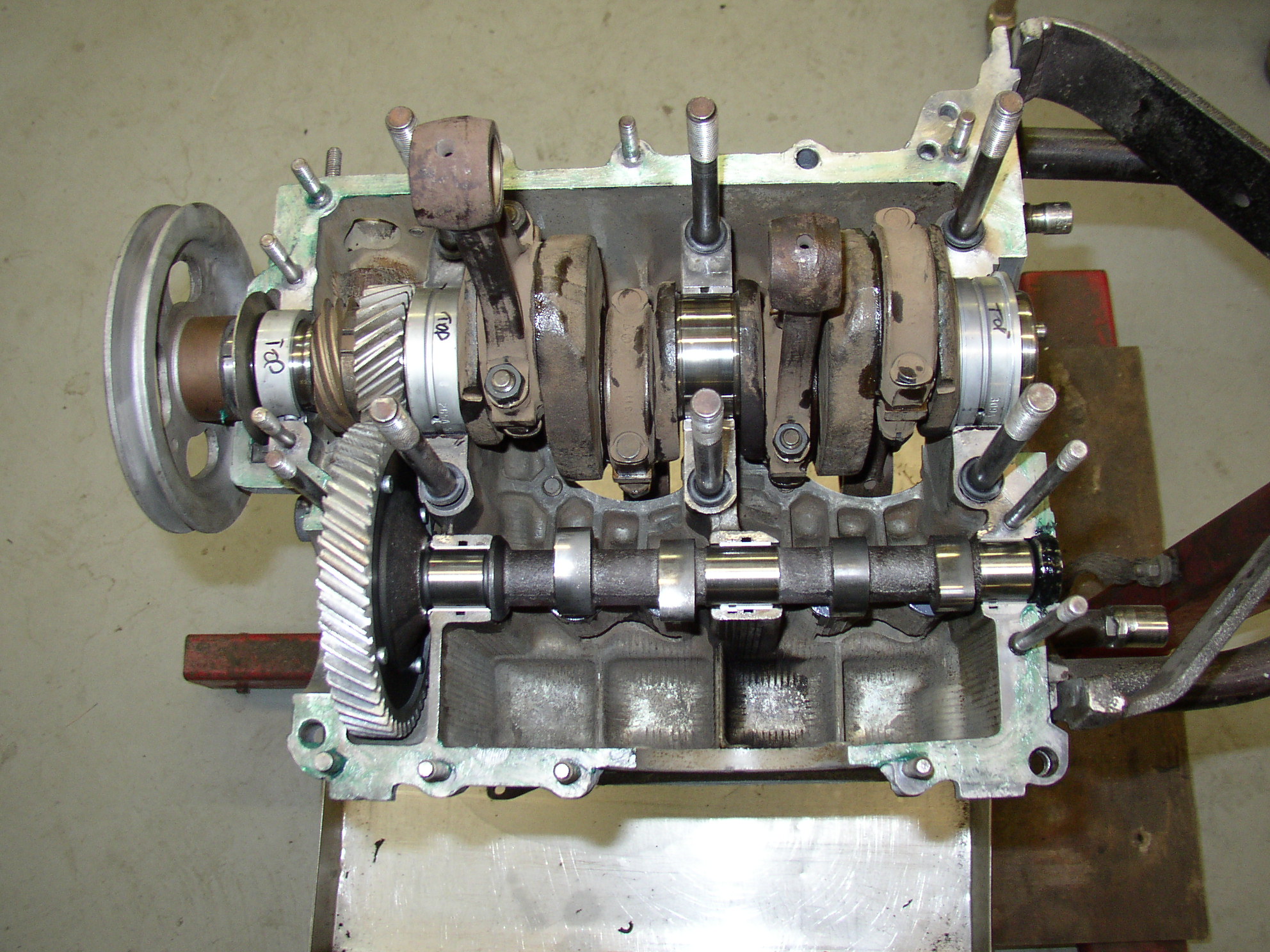 Here's the short block done, it spins freely with zero effort. I've been drilling an extra drain hole in the case to relieve pressure on the rear seal, the hole should be at 6 o'clock and the Germans put it at 8 o'clock for some reason. This leaves an ounce of oil against the lip of the seal when the car is parked and sometimes ends up on the driveway. The heads had less than 1000 miles since last ground, I disassembled them..... And blasted everything. I don't like the "valve grinding compounds" sold lately for lapping as they're too coarse and make little grooves in the valve face and seat, it's like sand in a paste carrier. I tried using rubbing compound this time and it worked great. (you can see a bit of it in the tub in the left background) I used a power drill running really slow and reversed directions a lot, maybe 2-3 seconds at a time and refreshed the compound. Parts done and ready to assemble, German jugs ball honed and checked, no wear or out-of-round measurable. Pistons soda blasted and re-ringed. Heads assembled and ready to go. I always air check heads as soon as they go on to make sure everything is air tight. The compound must have worked well as there was not a bit of leakage. Long block done. Oil system complete and priming, I was able to get 40psi cranking. Note the spark plugs and rocker shafts are off to relieve pressure, the engine spins very free like this to build oil pressure. You can see the "4" written on top of the piston and the notches in each jug to match- 4 notches on #4 jug, 3 on 3. I only use engine oil as an assembly lube, no fancy greases or assembly lubes. Runs perfect and great oil pressure, I use a really thin oil initially on the stand (like 0w-20) while the rings seat in for a few hours and then change to 0w-40 Mobil 1. I'm not finishing the sheet metal trim on this engine because I don't know what it's going into, that's why there's VGs on the heat riser pipes.