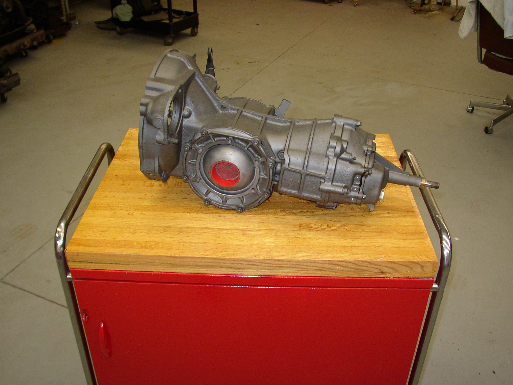Jim's Custom finally got my tranny done so I picked it up at the show Saturday. It needed the normal stuff, a couple of synchros, 1st gear, bearings, etc. I'm splitting my time between Sean's motor and Bus 2 right now. I got Sean's long block done so I'm going to change my tranny now. Exit motor! Exit trans! I sure wish I could snap my fingers and get those axles to jump over from the old trans to the new trans. These things are a royal PITA to change axles on, the whole RGB and everything has to be torn down. At least it's all fresh so it shouldn't need anything.