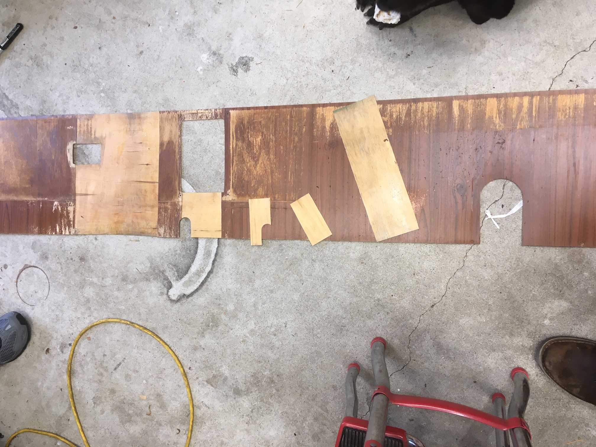 The wall panel behind the fridge and sink was pretty warped and delaminated. I want to fix it because the wood species/pattern matches the other panels which I have sanded down and refinished. It is not stock but does not look too bad. The one on the right side of the seat was delaminated and I was able to glue and clamp it back together. This on however was delaminated and wrinkled up on the two outer layers. So with nothing to lose, I couldn’t make it any worse