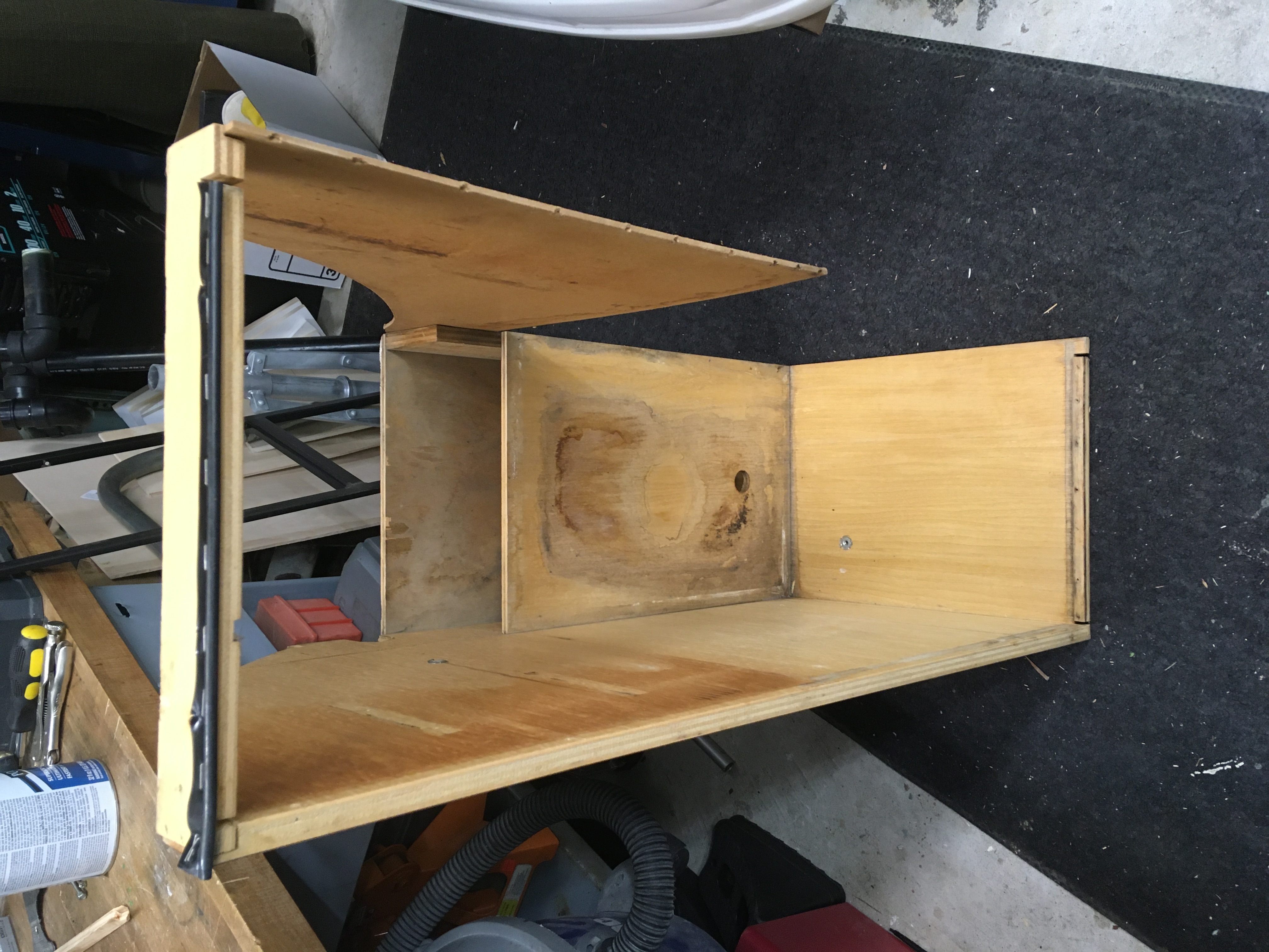 Today I worked on the refrigerator cabinet. It had a bit of water damage from the vent window that had been leaking. There was a piece of laminate missing on one end and a layer of the plywood underneath. I mixed some epoxy wood filler to level out the missing plywood layer and the will glue in a new piece of laminate. The bottom of the cabinet had begun to delaminate so I glued that back together and then used some epoxy filler for the gaps. The rail that the refrigerator lid and storage compartment lid attached to had loose holes were the hinge attached. I used some gorilla glue and toothpicks to fill the holes and the drilled new smaller holes My son and I cleaned and polished the galvanized sides of the fridge. Tomorrow I plan to sand and varnish the bottom area under the fridge and back side. The laminate on the front is in pretty good shape.