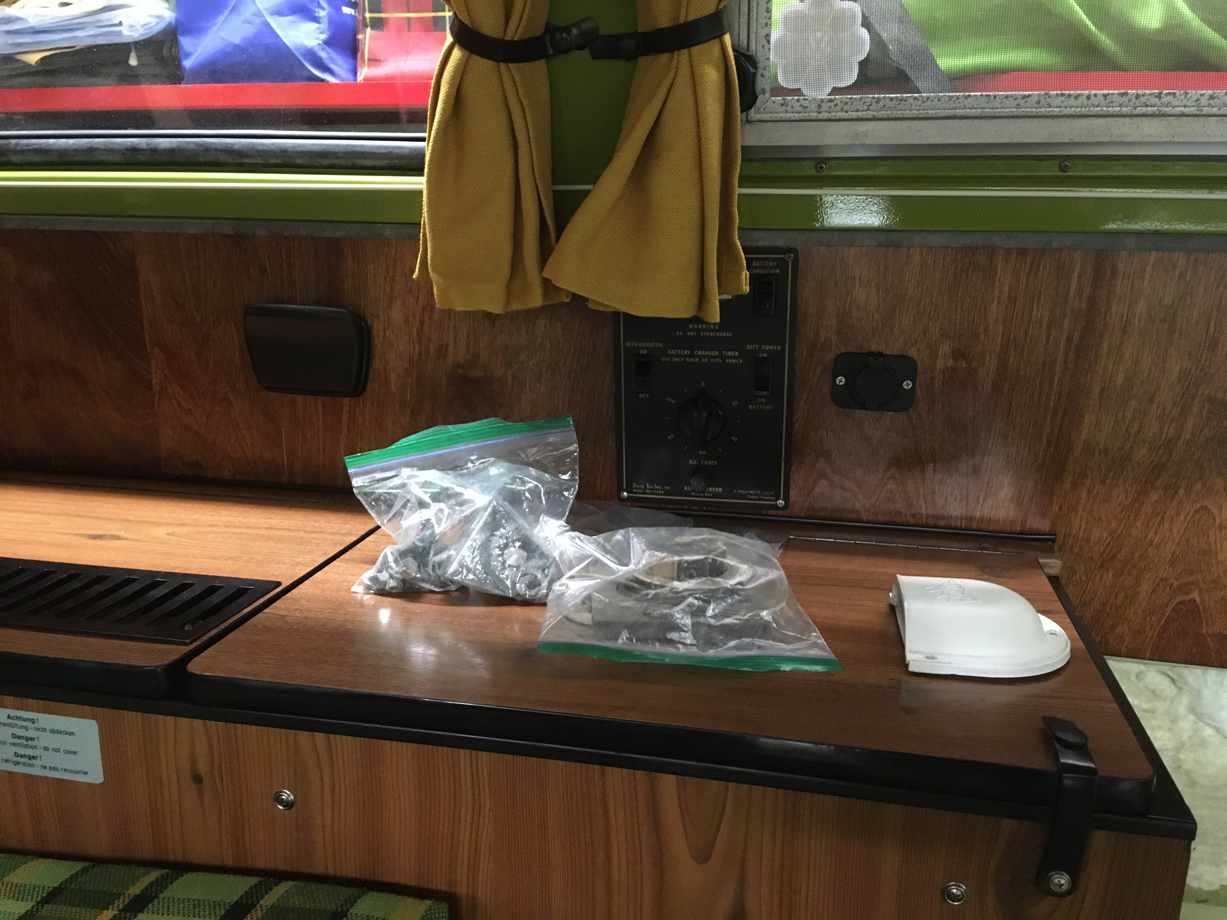 Also restained/refinished the back of the seat and repaired the seat prop while I had it out ( I did not even know it was a thing until I saw someone use it Kelleys. I had found the prop under the back seat when I bought bus, along with a lot of other stuff. Thankfully I kept it! At any rate it is handy. Used a slightly larger carriage bolt than what was originally there so it was a little stronger. Now just have the main cabinet to go....for this round of repairs.