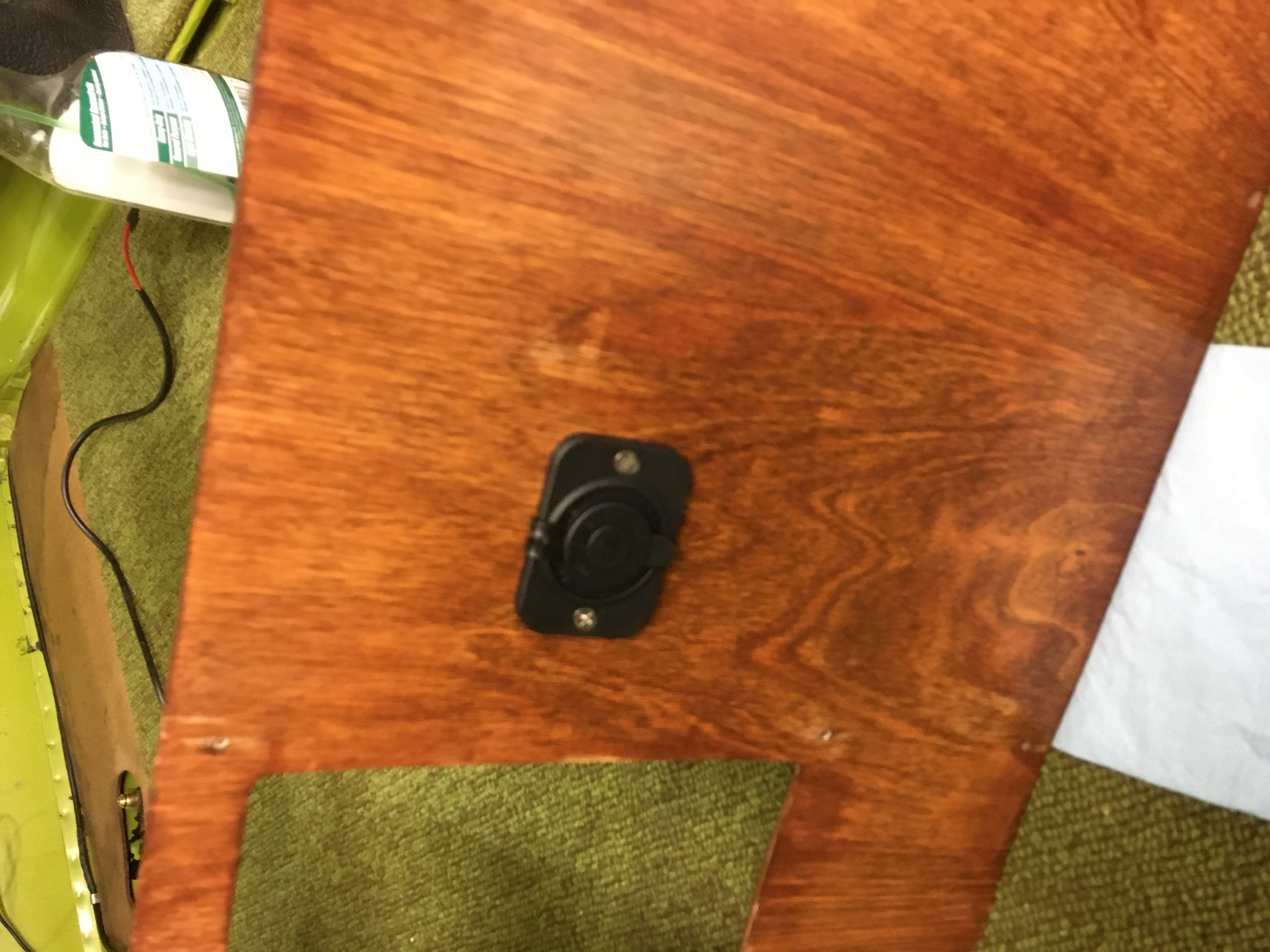 Using the face plate of the 12v receptacle as a template I drilled the holes through the wooden panel. Knowing that this would be pushed on, I decided to reinforce the back with a metal plate. The factory had done this for the power panel( galvanized strip in photo, so if it was a good idea for them.... I used a sheet of 22 gauge steel marked the holes and then drilled and dremmeled them into shape. I painted it black, glued it to the back of the wood panel with contact cement and then mounted it with stainless screws, fender washers cut to size and lock nuts. Like the factory strip it contacts at the top and bottom the two ribs running along the wall of the bus.