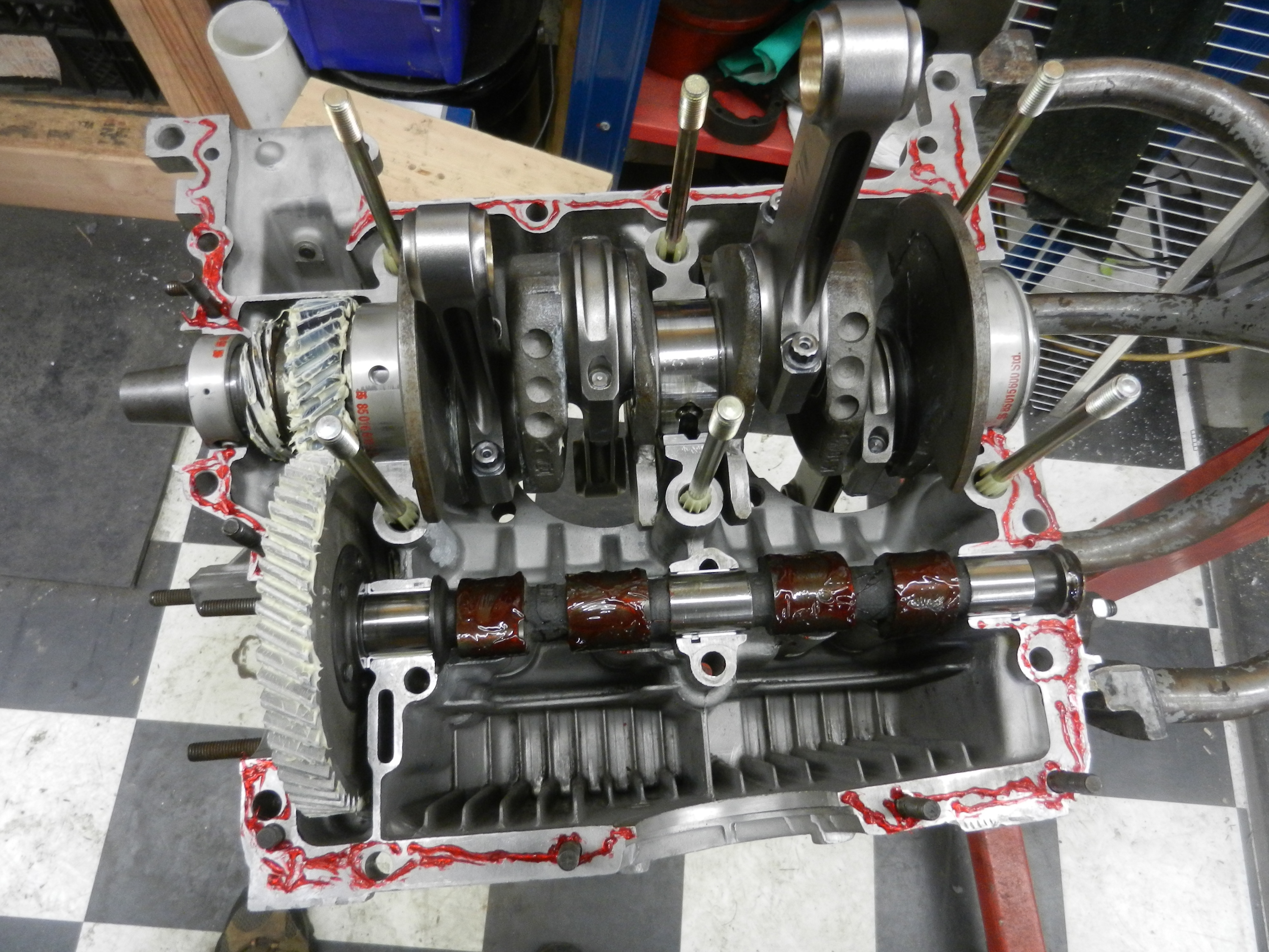 Now we can apply the case parting line sealer. As Bruce mentioned, there are many and they all work, except, NO RTV here. It builds too thick and does not allow for proper bearing crush. I have been using Locktite 518. One case half only.