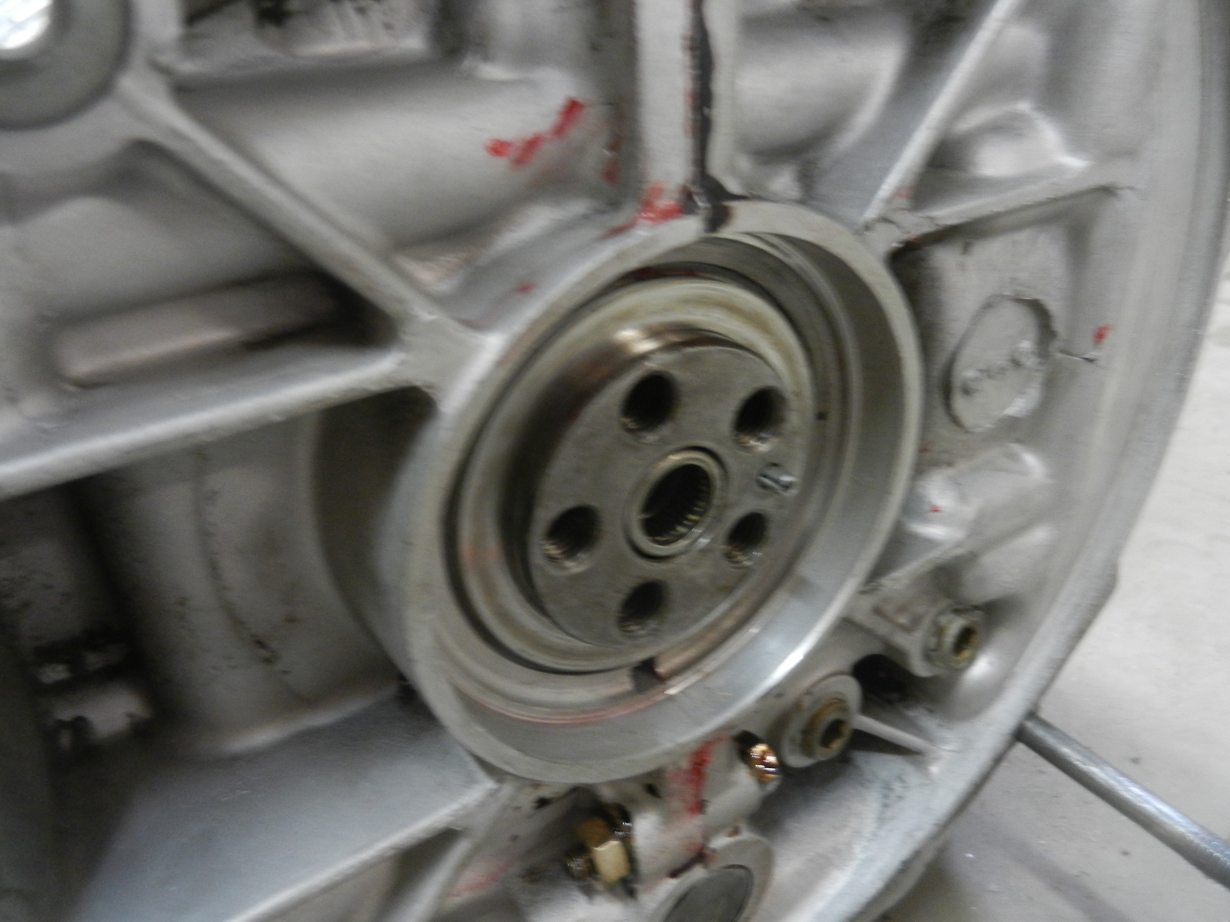 Before we install the flywheel, clean up the mating surfaces and remove the o ring if it is still there. ( don't forget to install the new o ring from the gasket set before final installation of the flywheel)