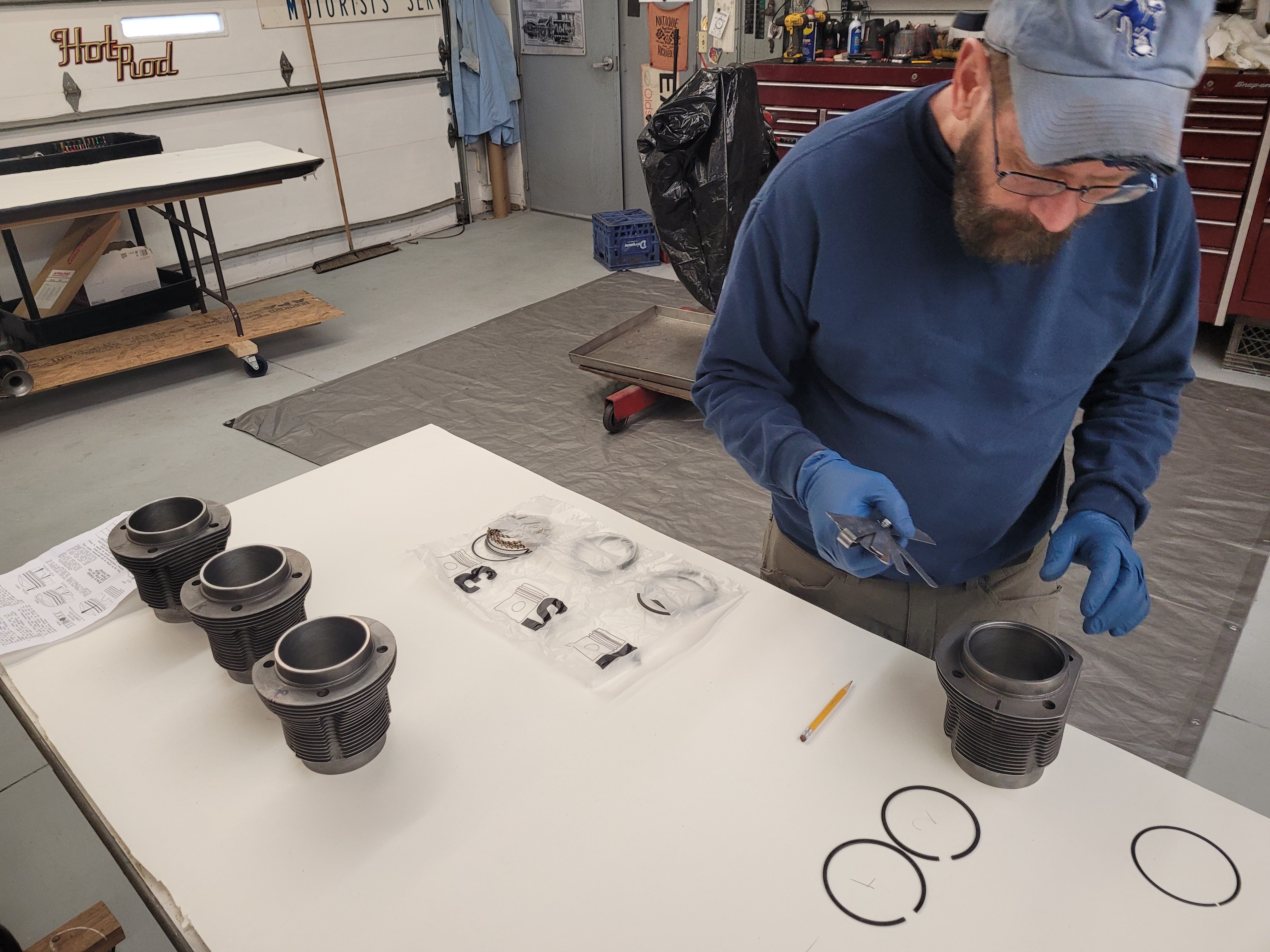 Rob's polishing the new crank with 2000 grit in the picture. We polish the cam journals, too, as I think that's what caused the premature cam bearing wear on my 2180. You can see and feel a difference after polishing with 2000. Rotating mass was balanced, too, and the pistons/rods are within a gram. (spec is 5 grams) Yes, I have a gram scale and it's for measuring parts, nothing else!