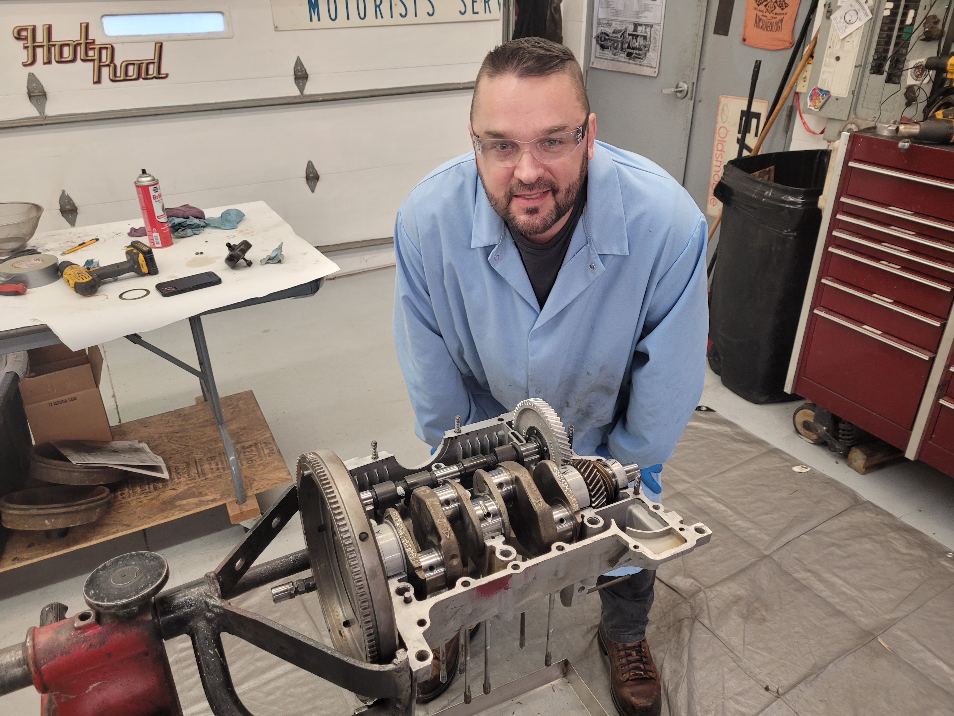 Anyway, we polished the crank and new cam journals, new hydraulic lifters, soda blasted the pistons and ball honed the jugs, new cast rings, took the best parts from 2 or 3 engines, new AMC heads, and put it together. Lee's son Luke also got in on the process.