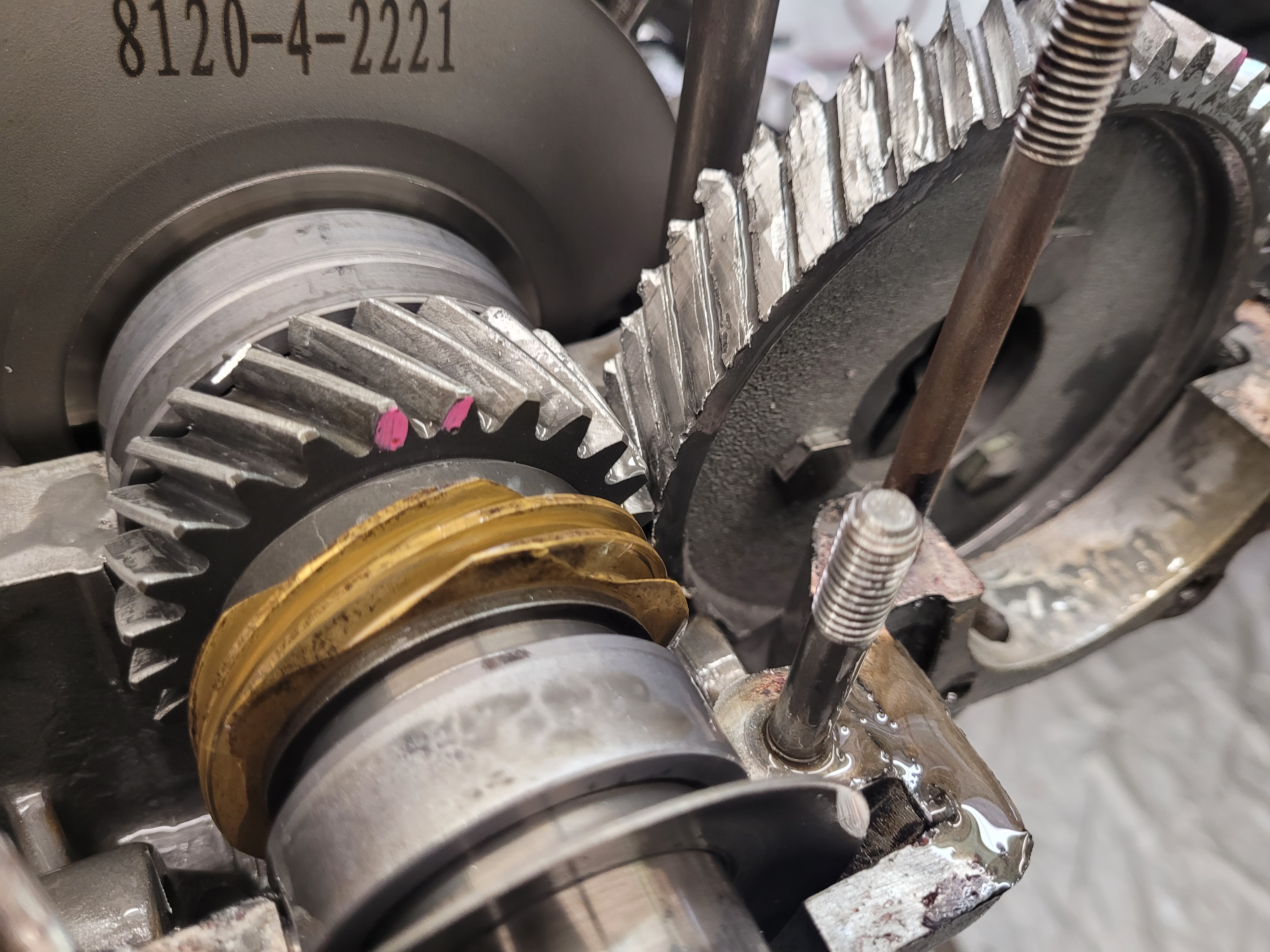 New aftermarket crank gear. We bought a new cam gear but the runout was way out of spec (.009") so we ended up using a nice original gear. Backlash was under .002" through 720* and did not walk out of the case.