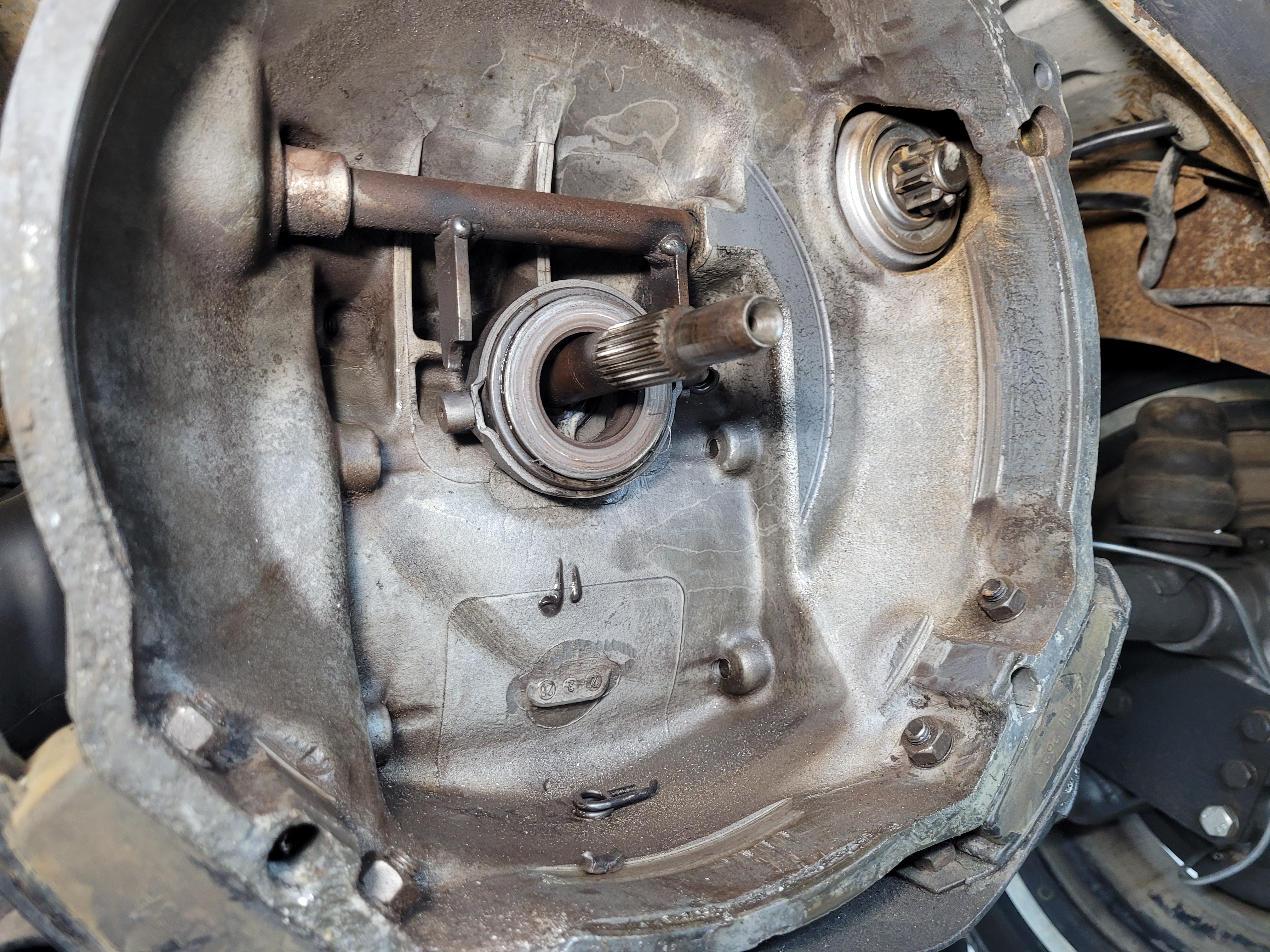 I had him towed to Bruce’s shop. Bruce’s initial assessment said it was something inside the bell housing, so the engine needed to come out. We worked on it today and found the clutch fork was broken. We decided to replace the clutch assembly while we had it all apart. Parts are ordered.