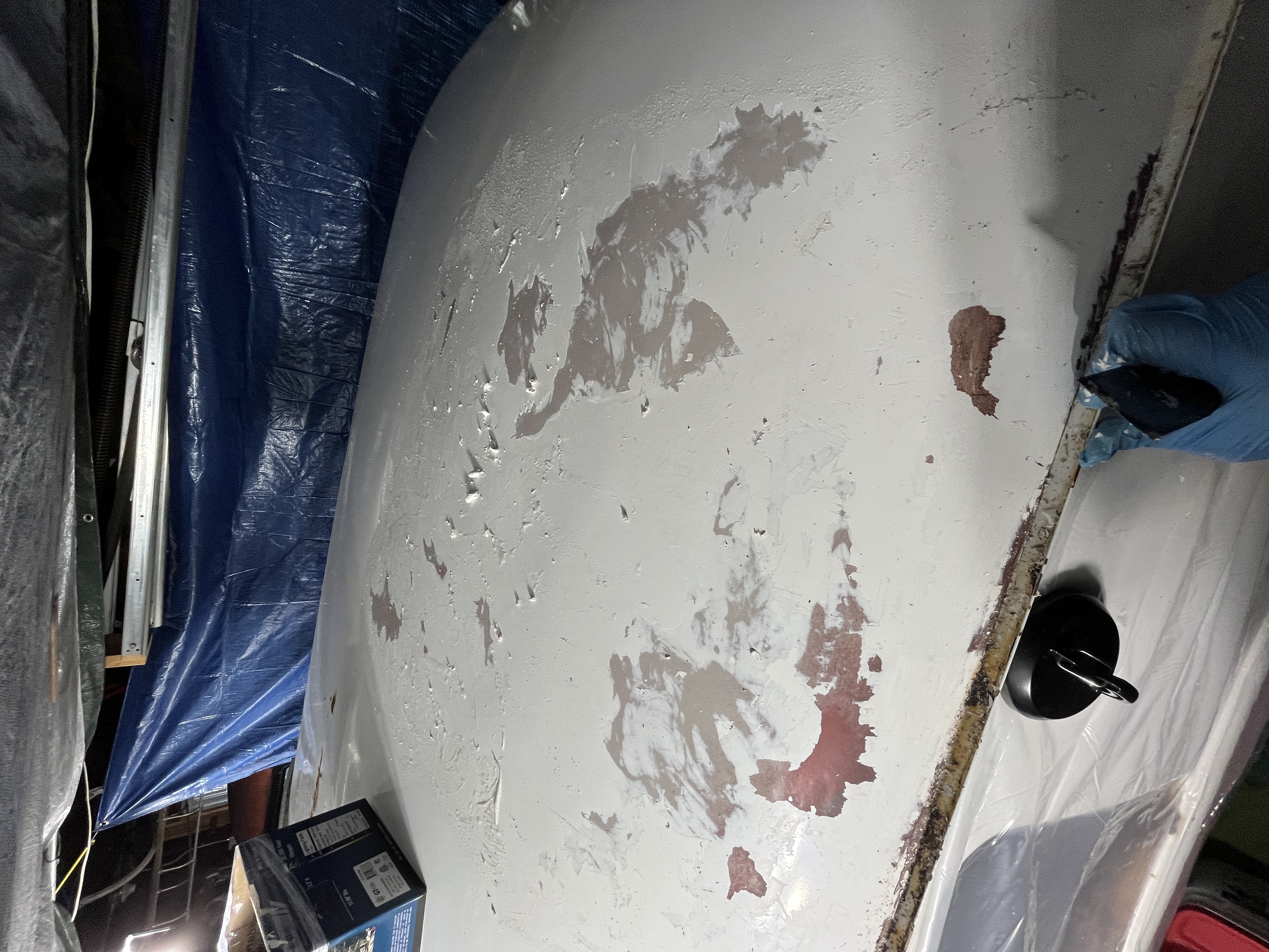 All the windows and interior door panels were removed. I decided to tarp off the entire bus from the gutter line down to keep from getting stripper inside. Then I dove in and started with some stripper on the roof. I am using Klean Strip and a draw knife and it seems to be doing the trick. Starting at the top going to work my way down to the sides.