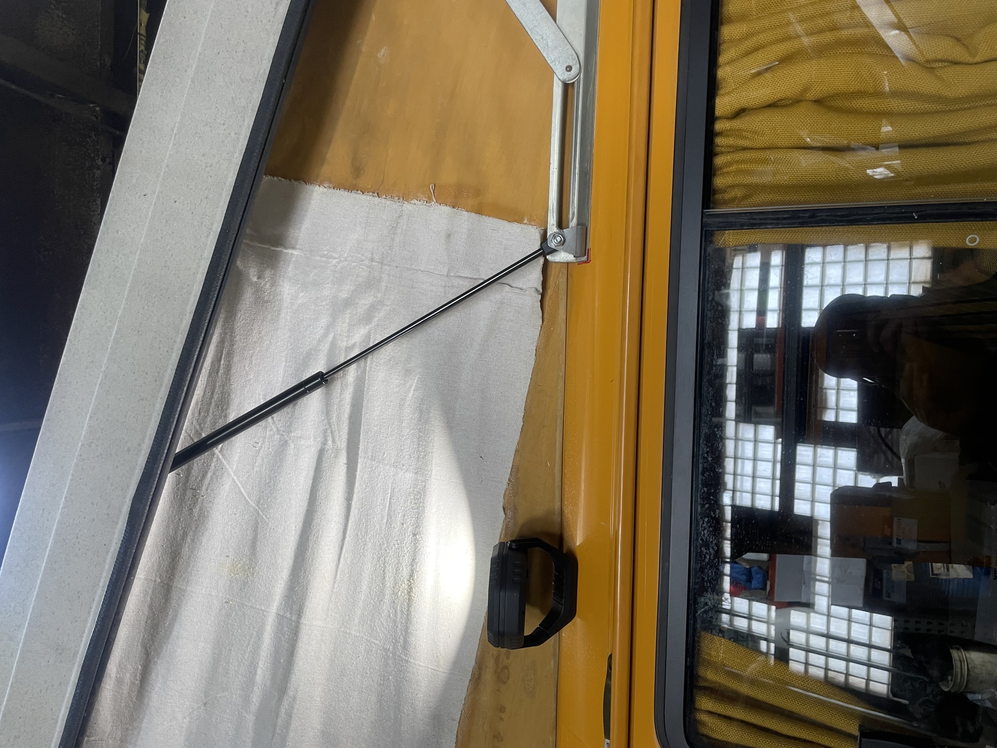 I started by installing the pop-top lift assist kit first. If any mistakes are made I could fix them later. Pretty easy install… The lift pistons use one of the bolts that hold the rear top hinge. Then the top of the pistons require drilling holes through the wood and fiberglass of the pop. I pulled out an angle finder to keep the drill at the same angle of poptop and make a nice straight hole.