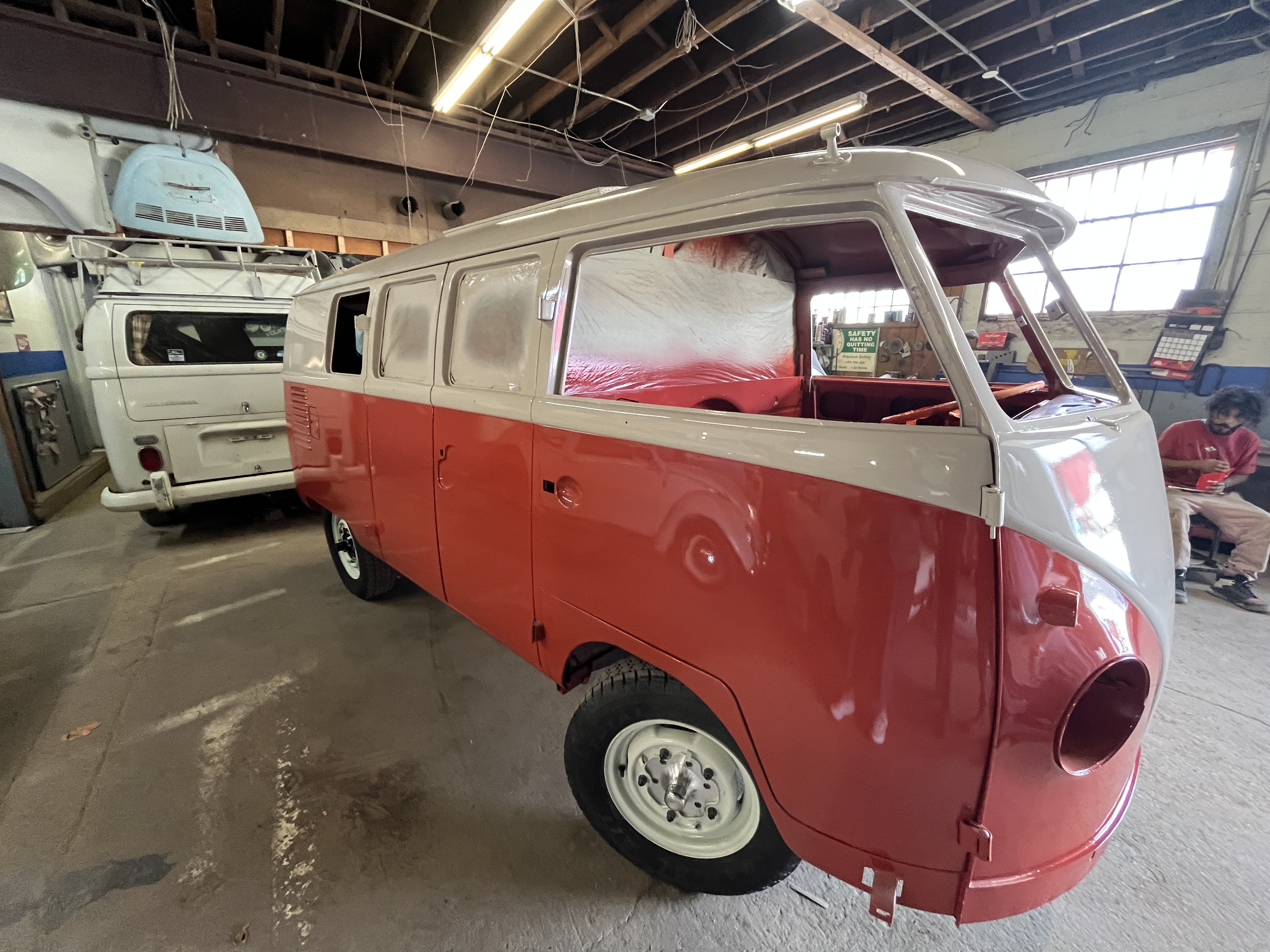 I stopped by the shop to drop off a little more paint. We are almost done. Looks like he will be ready next week to get shipped out. The frames, bumpers and little parts are on deck for paint next. He’s looking great!