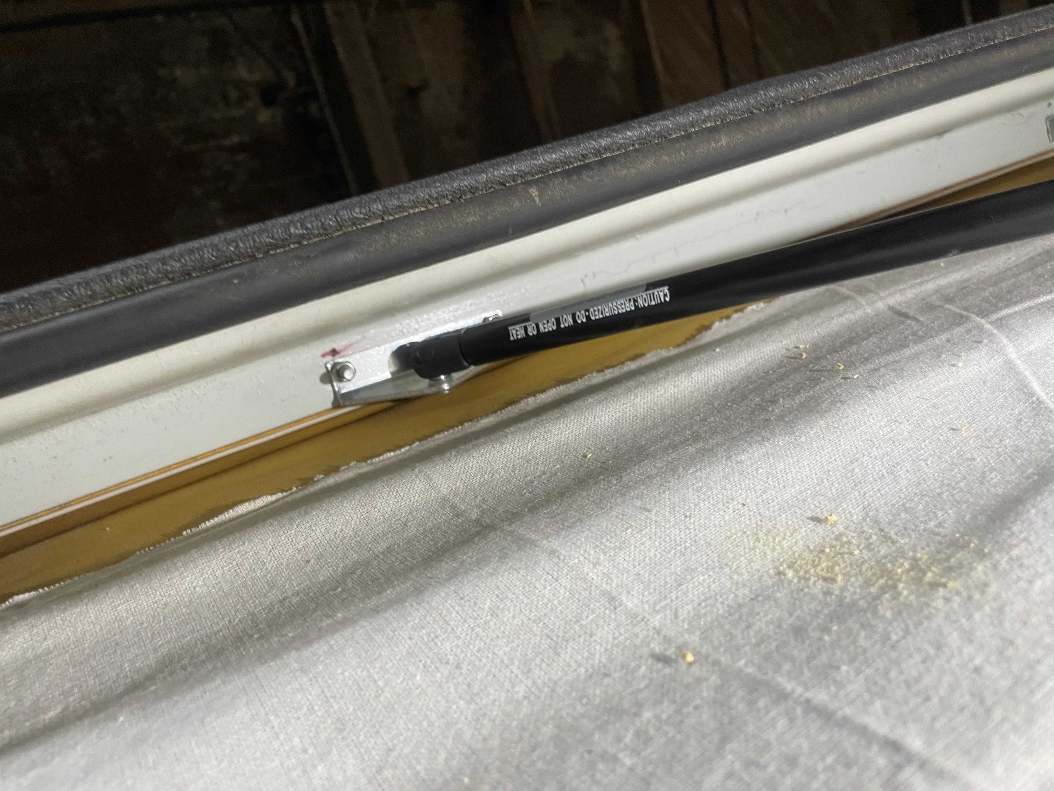 I started by installing the pop-top lift assist kit first. If any mistakes are made I could fix them later. Pretty easy install… The lift pistons use one of the bolts that hold the rear top hinge. Then the top of the pistons require drilling holes through the wood and fiberglass of the pop. I pulled out an angle finder to keep the drill at the same angle of poptop and make a nice straight hole.